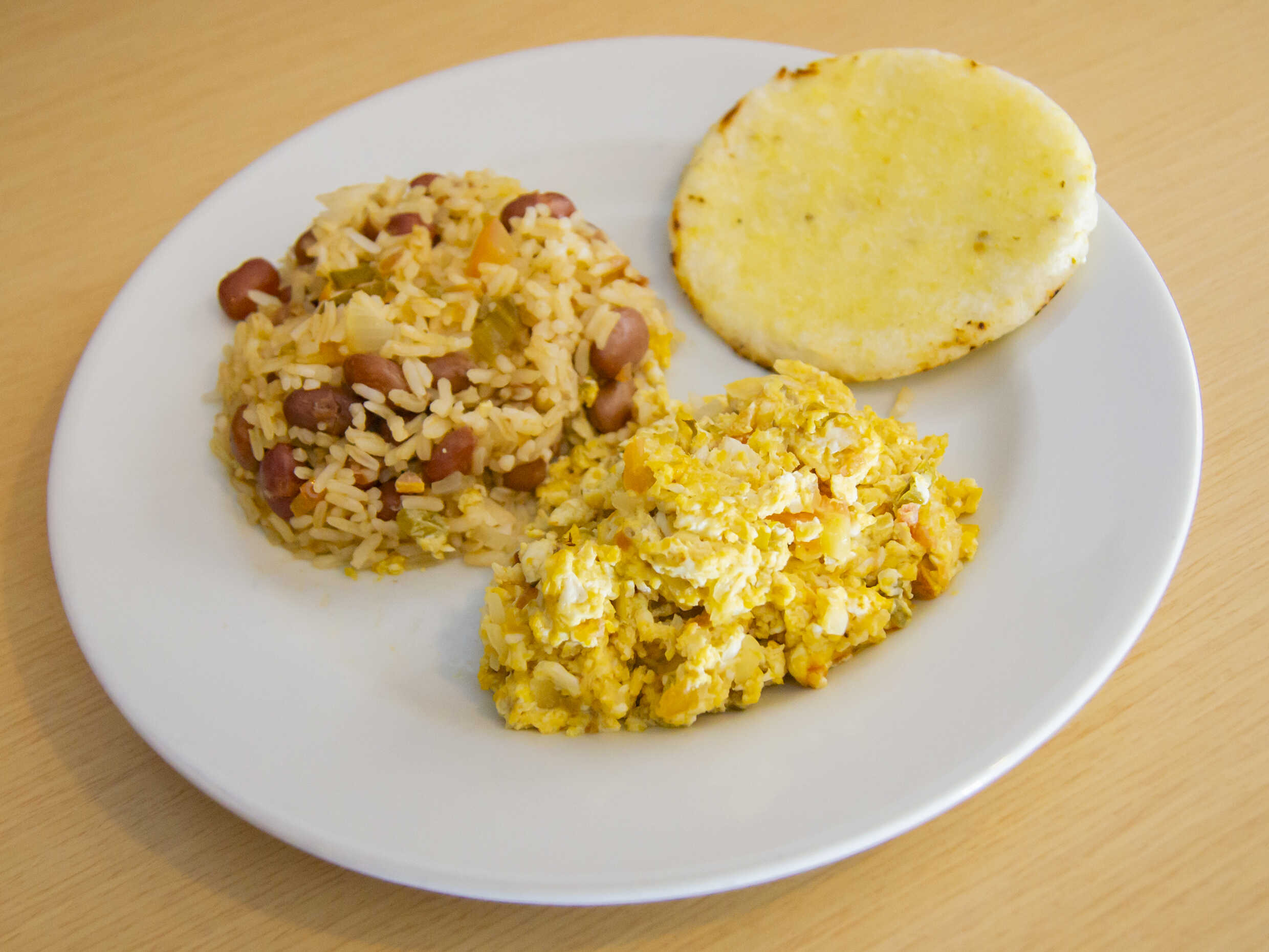 Frijoles con arroz, huevos revueltos con hogao y arepa con mantequilla