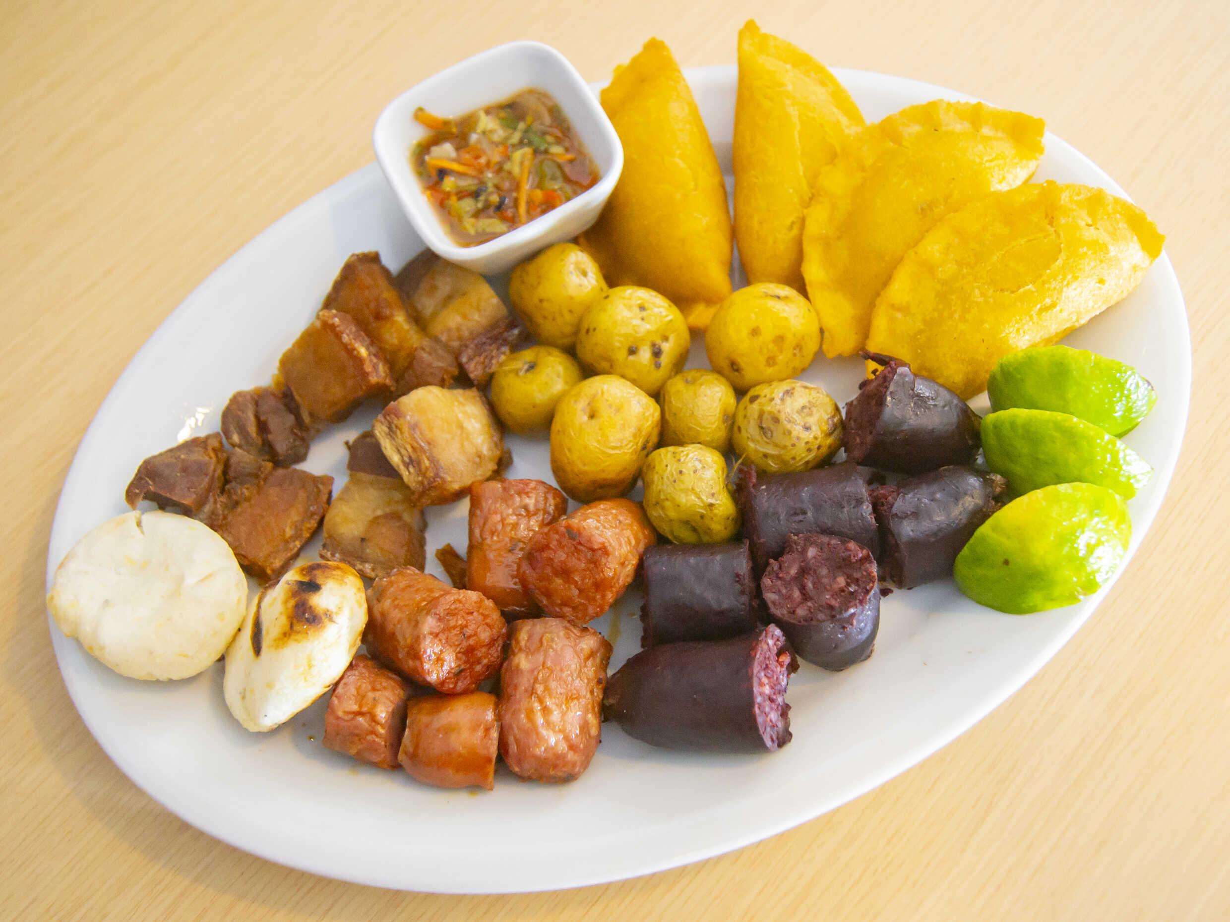 Empanadas de lechona (4 und), morcilla, chorizo, chicharrón, arepas y papitas criollas