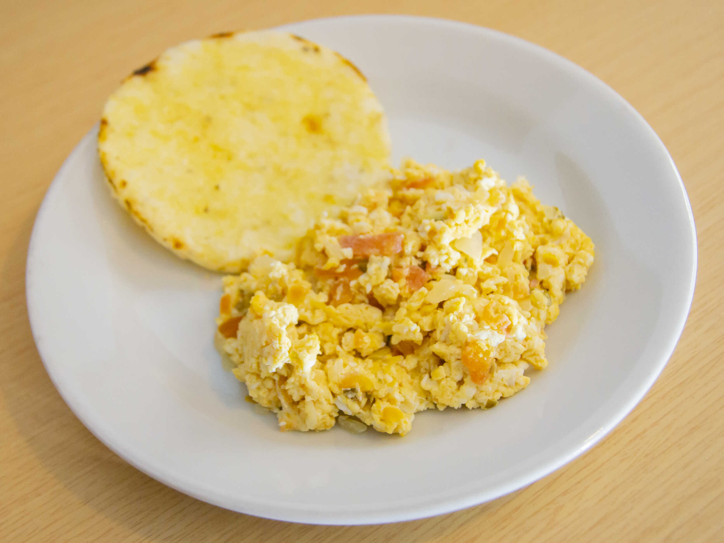 Dos huevos revueltos con hogao acompañados de arepa con mantequilla.