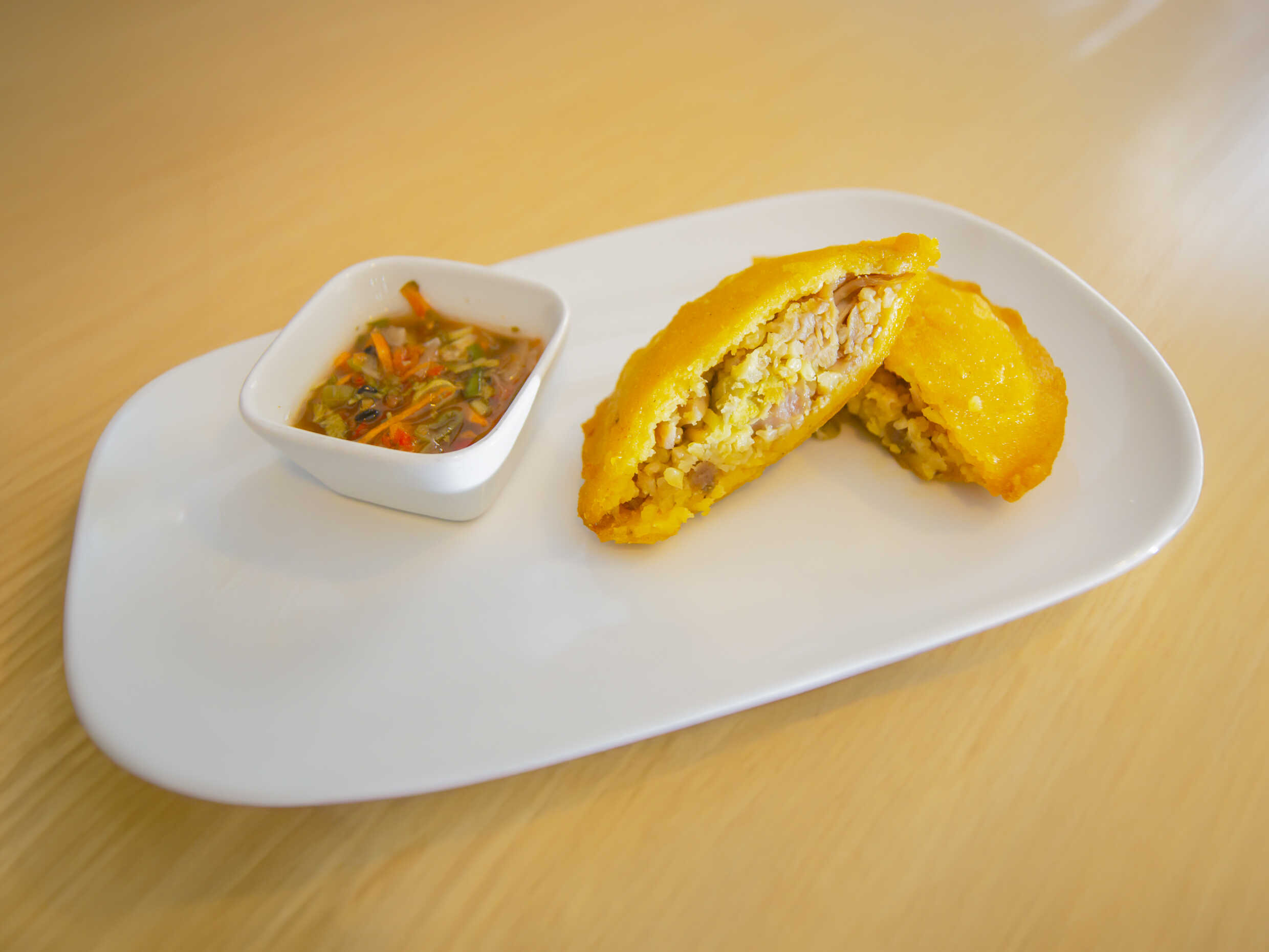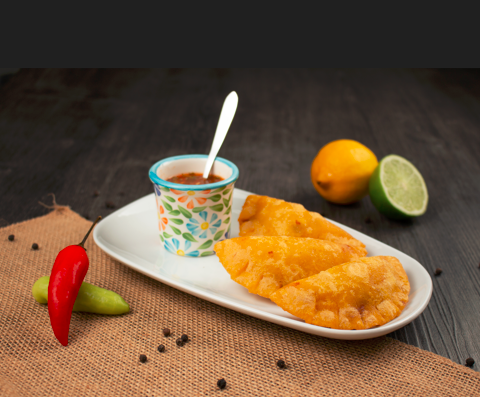 3 empanadas de lechona acompañadas con ají casero.