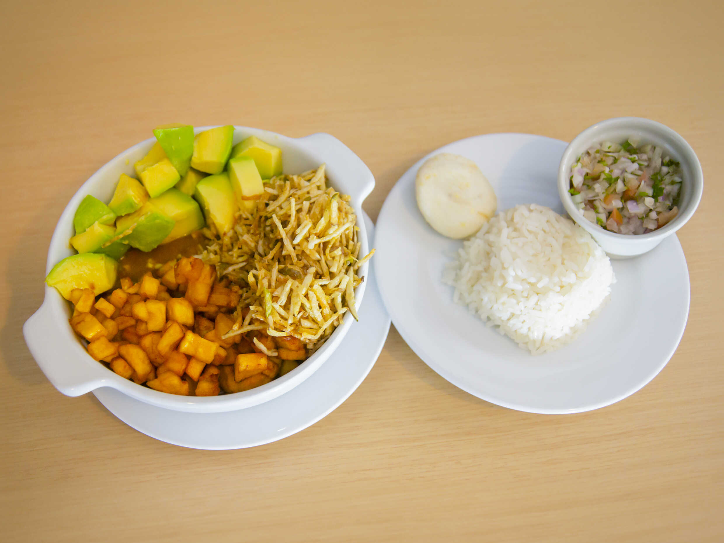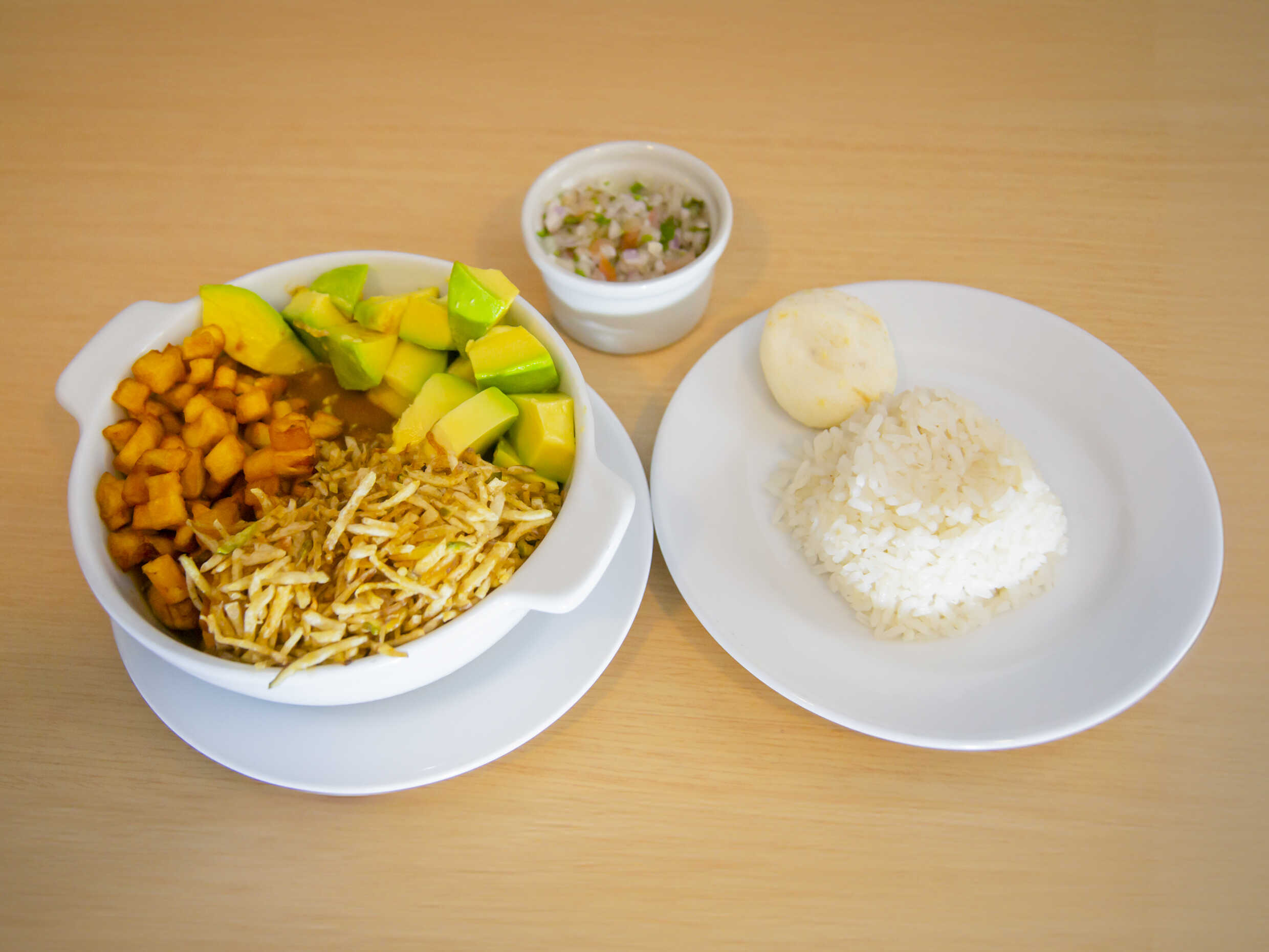Acompañado con arroz, banano, aguacate, cilantro y arepa.