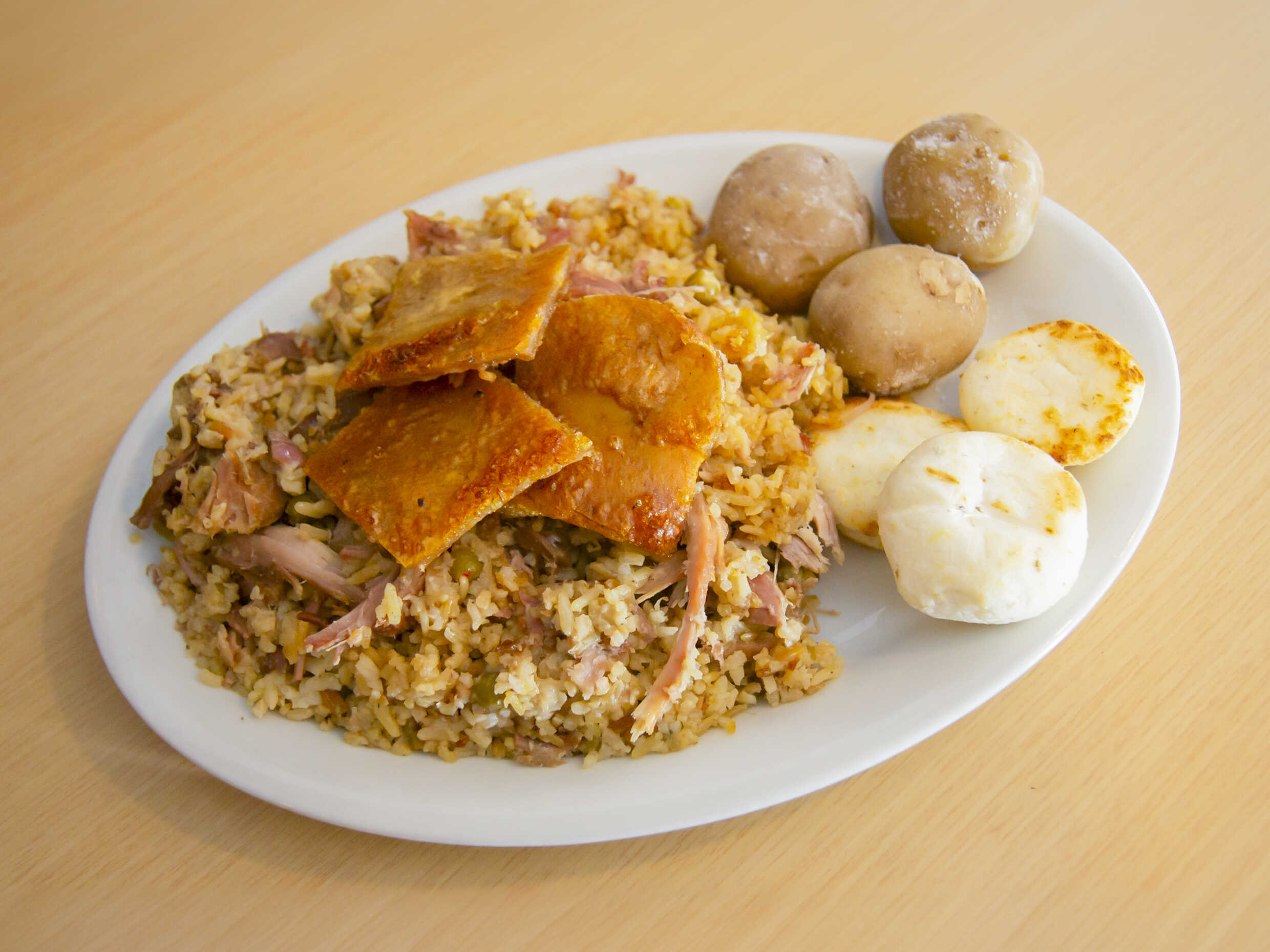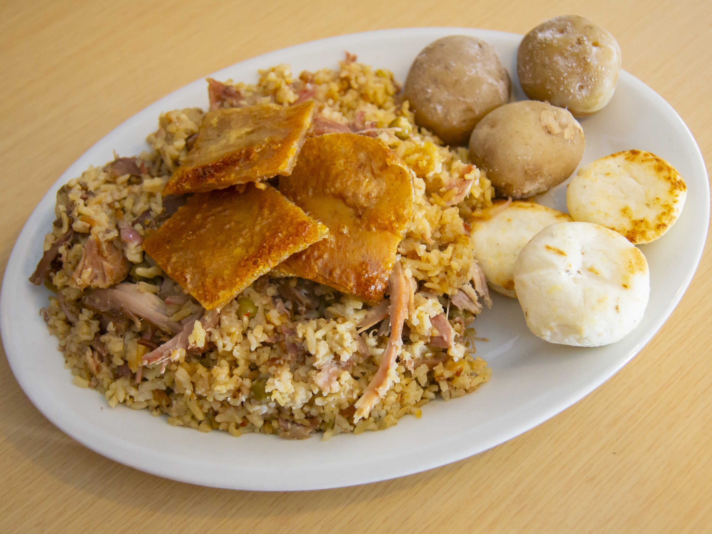 Lechona tolimense 300gr acompañada con papa al vapor y arepa.
