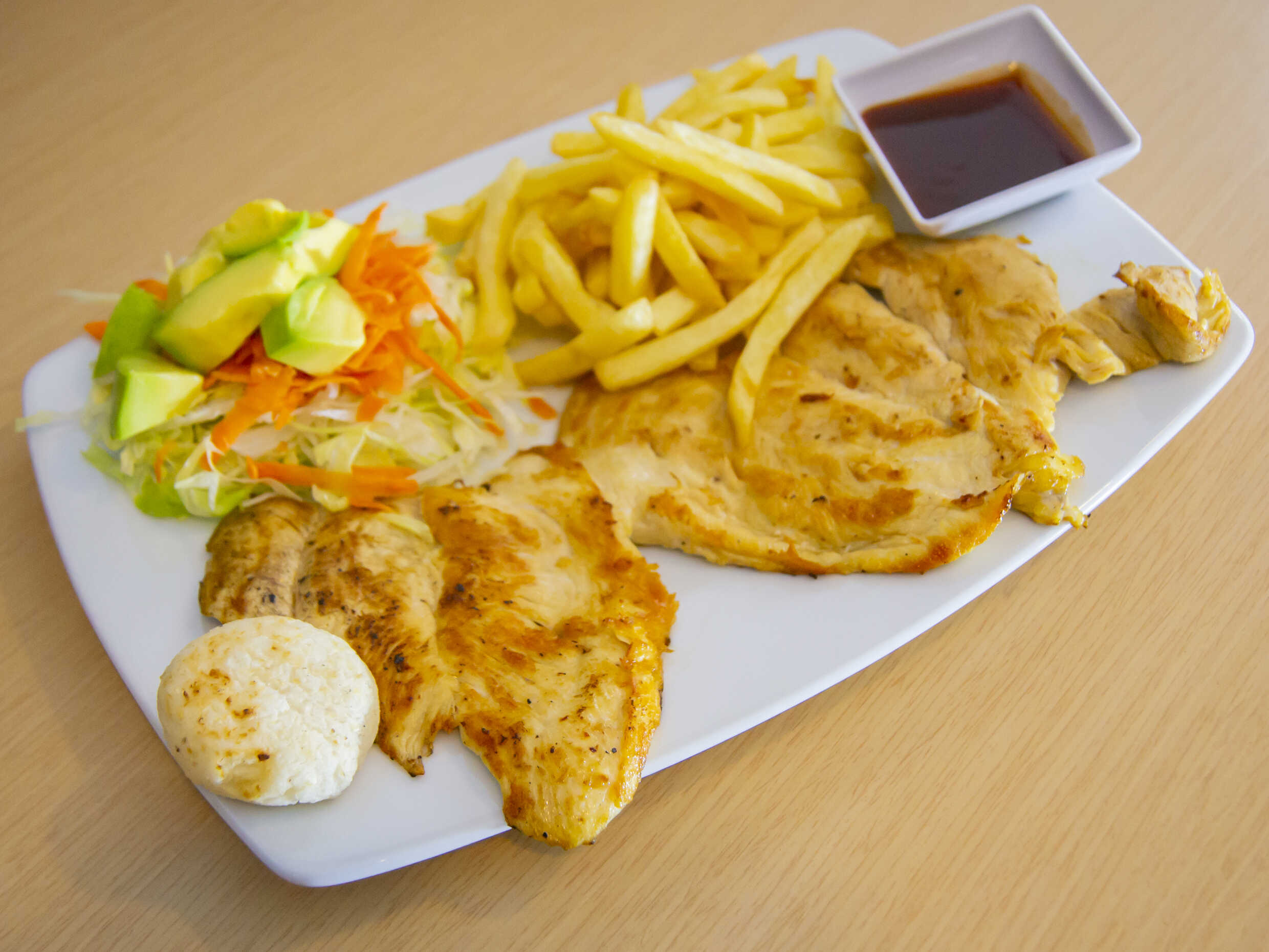 Pechuga a la plancha acompañada con papas a la francesa y ensalada. 300 g.