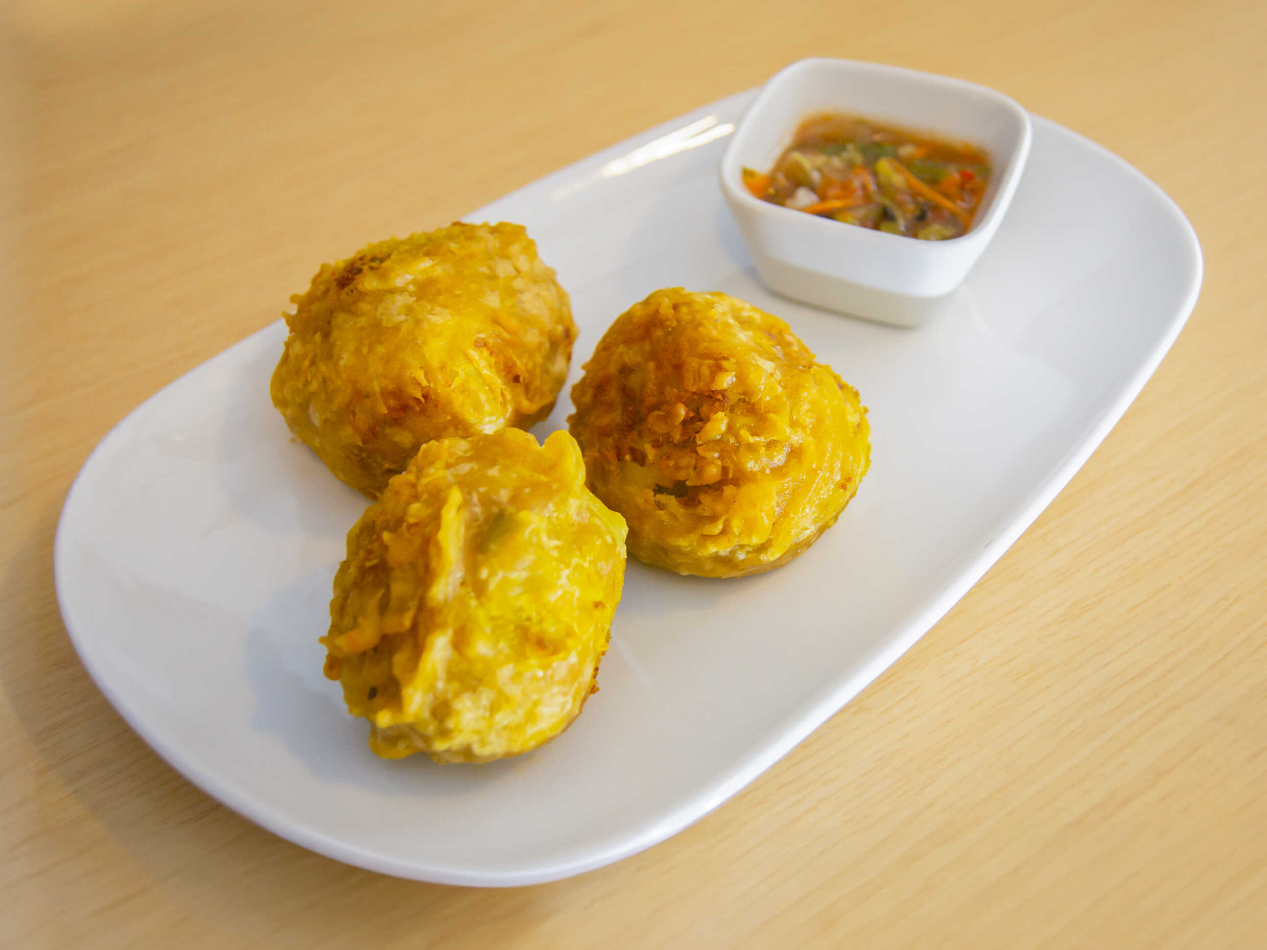 3 papas rellenas acompañadas con ají casero.