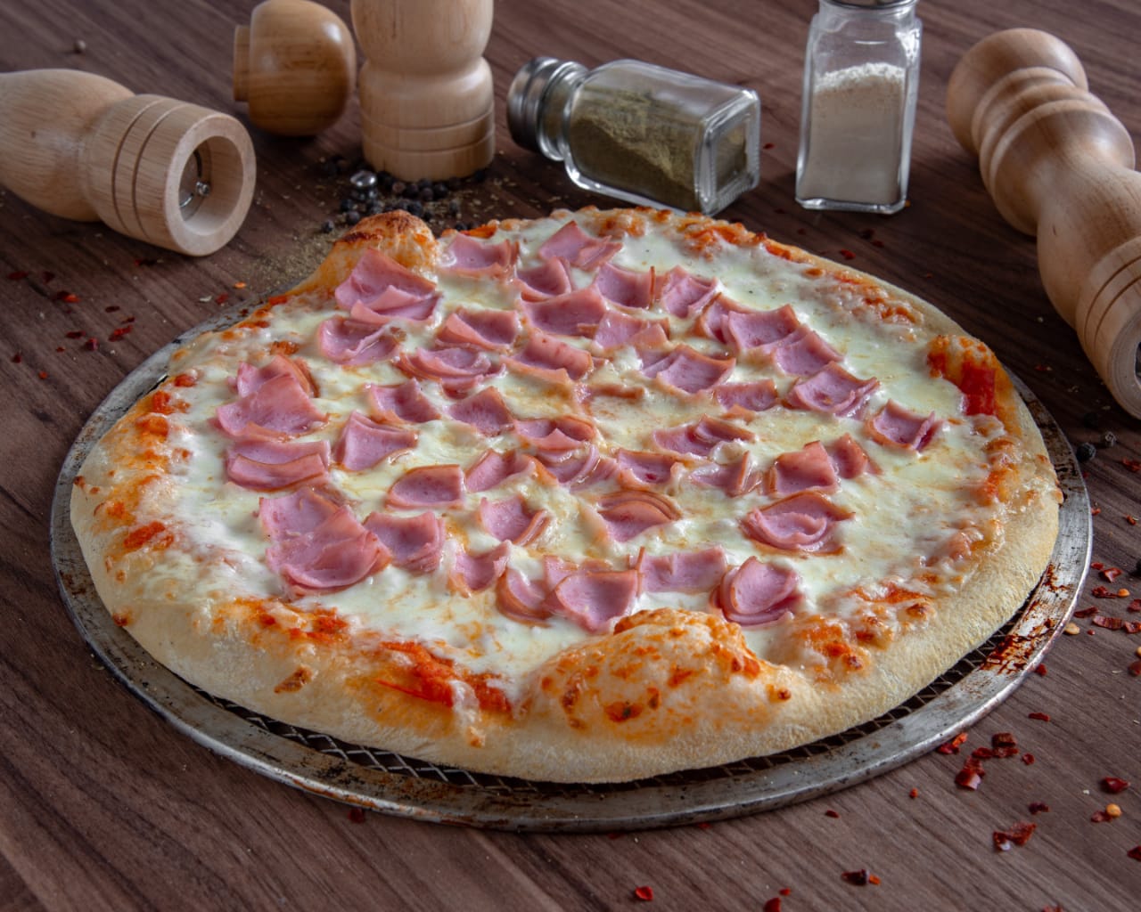 Pizza tradicional con queso mozzarella, salsa napolitana, jamón y piña.