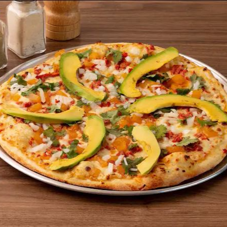 Pizza de la casa con mozzarella, salsa verde de picante suave, cerdo marinado al pastor, piña, cebolla, cilantro y aguacate.