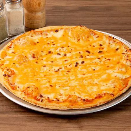 Pizza tradicional con salsa napolitana, mozzarella y salsa de queso cheddar.
