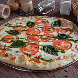 Pizza tradicional con Mozarella, salsa napolitana, tomates, albahaca y salsa pesto,