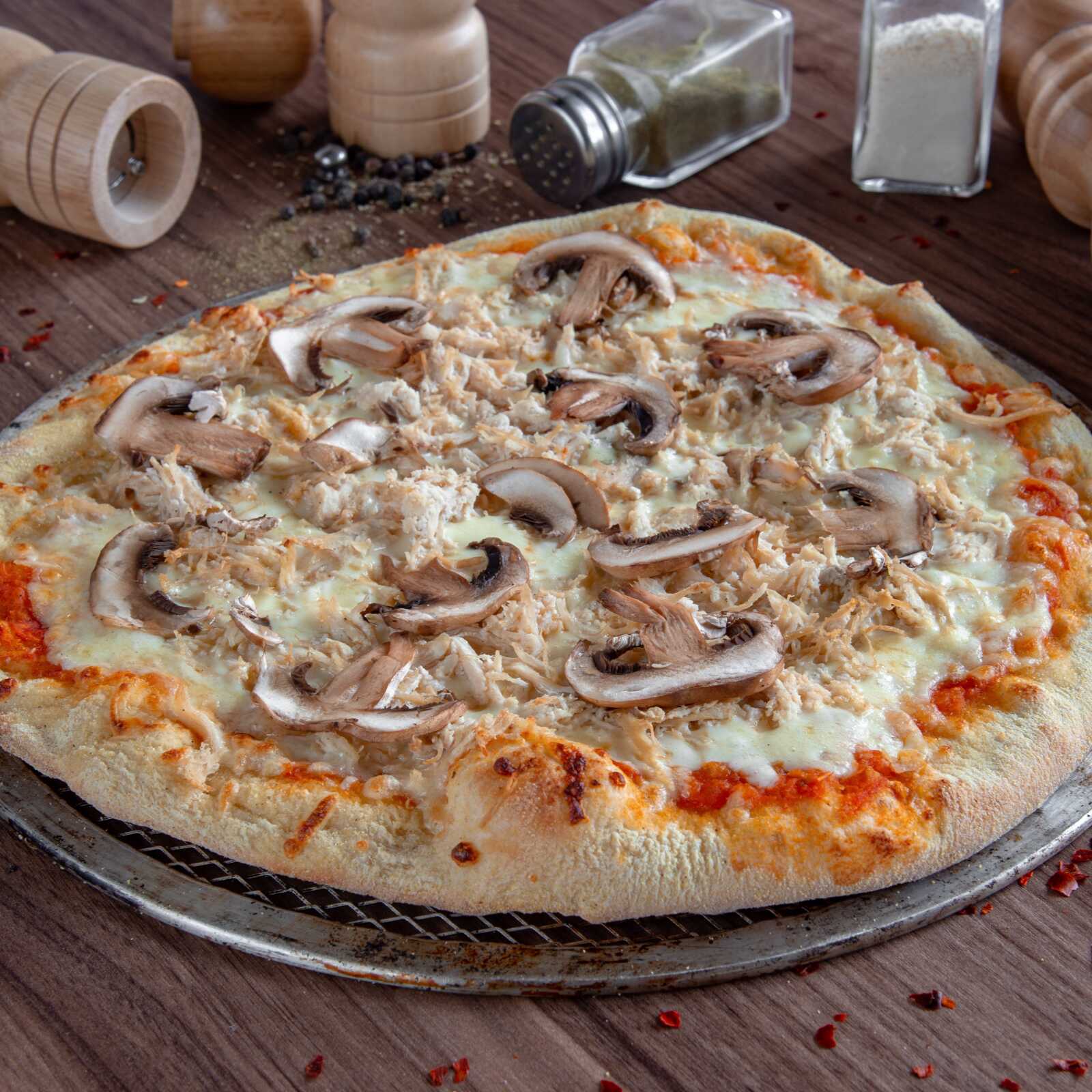 Pizza de la casa con salsa napolitana, queso mozzarella, pepperjack, salsa de queso cheddar y parmesano.