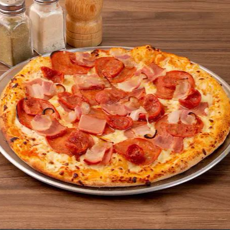 Pizza carnívora con mozzarella, salsa napolitana, pepperoni, tocineta, chorizo y jamón.
