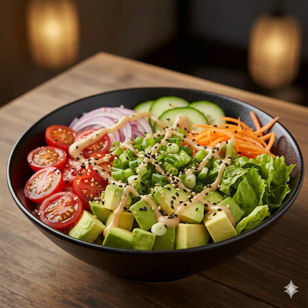 Donburi vegetariano (fresco): Base con arroz de sushi, tomate cherry, cebolla morada, pepino, aguacate, zanahoria, lechuga crespa, aderezo con vinagreta clásica de la casa, decorado con cebollín y ajonjolí tostado.