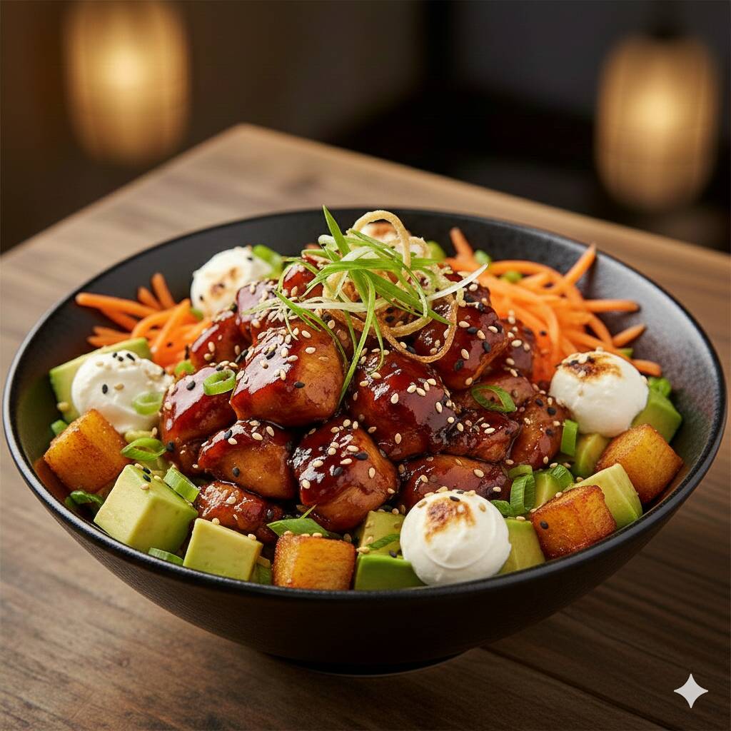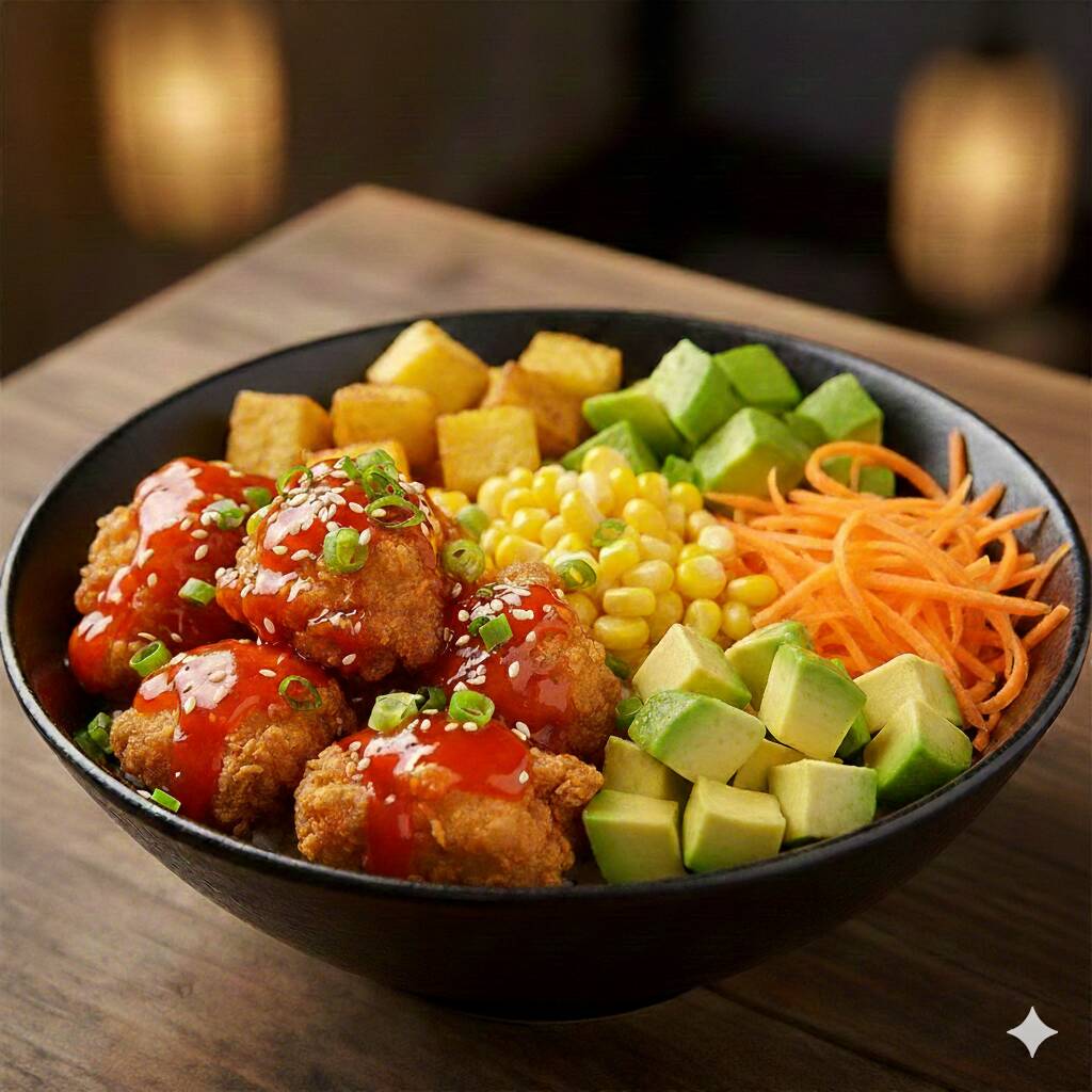 Donburi de pollo agridulce: Base de arroz de sushi, pollo crocante, bañado en salsa agridulce, plátano maduro en cubos, maíz tierno, zanahoria, aguacate, decorado con cebollín y ajonjolí tostado.