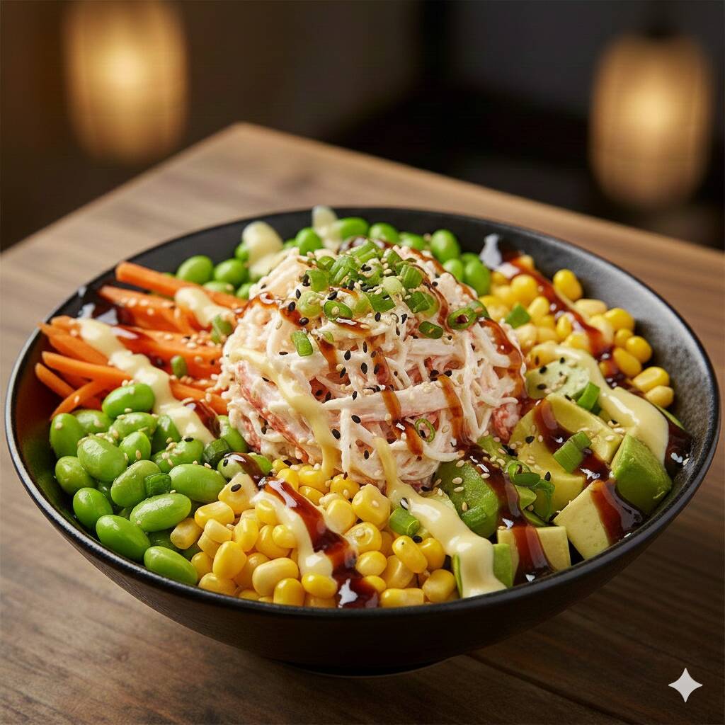 Donburi dinamita: Base con arroz de sushi, pasta de cangrejo con salsa de la casa, edamame, zanahoria, aguacate, maíz tierno, decorado con cebollín y ajonjolí tostado.