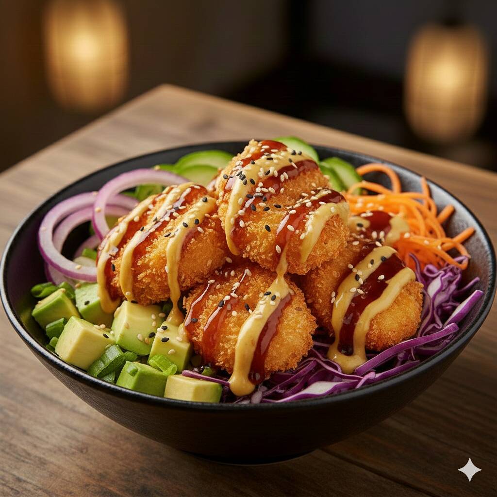 Donburi de camarones: Base de arroz de sushi, camarones crocantes con salsa de la casa, cebolla morada, aguacate, zanahoria, repollo morado, decorado con cebollín y ajonjolí tostado.