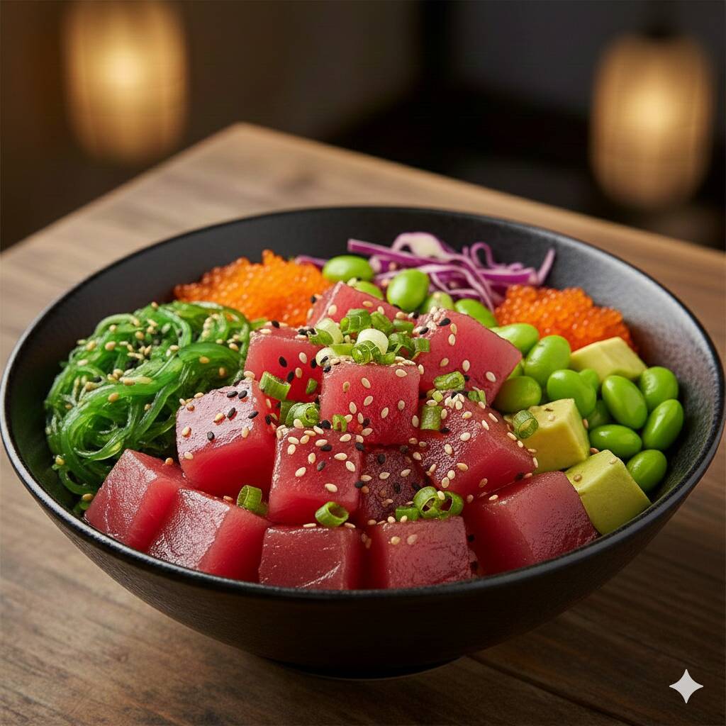Donburi wakame tuna: Base con arroz de sushi, atún importado, ensalada de wakame, masago (gaviar de cangrejo), aguacate, edamame, repollo morado, decorado con cebollín y ajonjolí tostado.