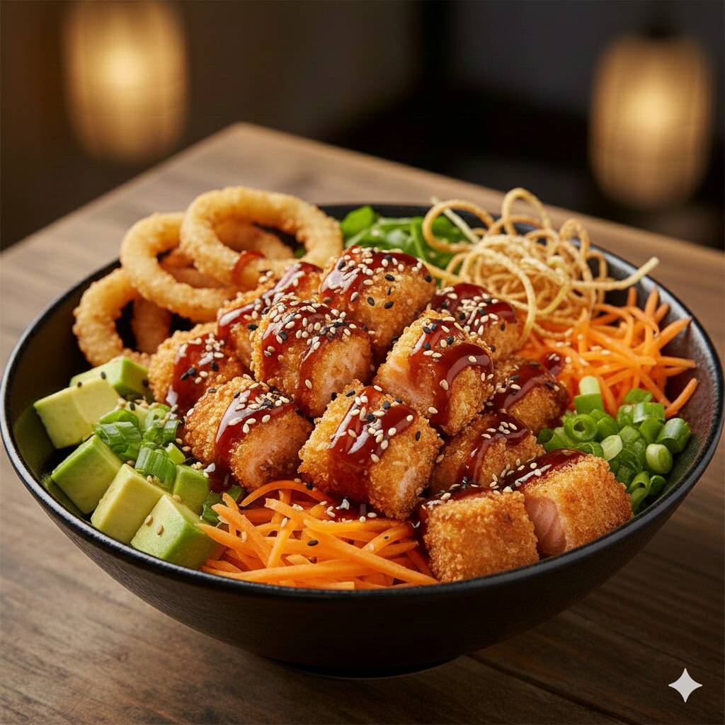 Donburi philadelphia tempura: Base con arroz de sushi, salmón crocante con salsa fuji de la casa, aros de cebolla crocante, aguacate, zanahoria, puerro caramelizado, decorado con cebollín y ajonjolí tostado.