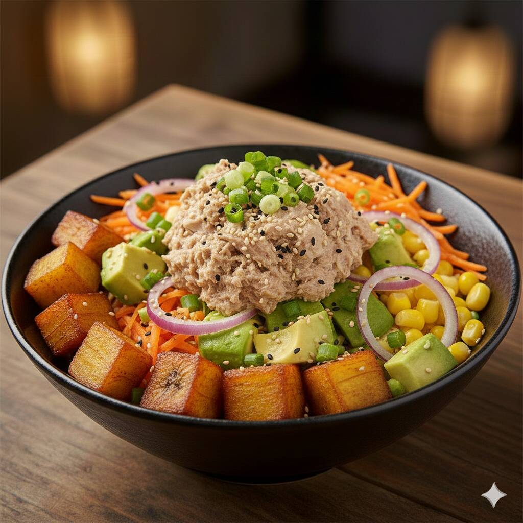 Donburi tropic atún: Base con arroz de sushi, atún enlatado (aderezado con mayonesa japonesa), platano maduro en cubos, aguacate, zanahoria, maíz tierno, cebolla morada, decorado con cebollín y ajonjolí tostado.
