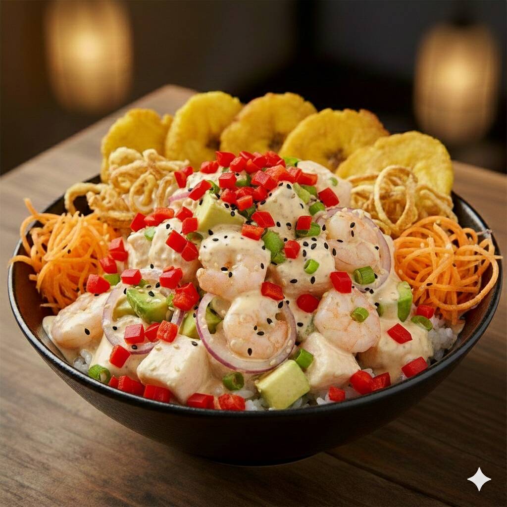 Donburi acevichado: Base con arroz de sushi, crema acevichada (pescado blanco, camarones cocidos, cebolla morada, pimentón rojo, mayonesa japonesa y cilantro), tostones de platano verde, puerro caramelizado, aguacate, zanahoria, decorado con cebollín y ajonjolí tostado.