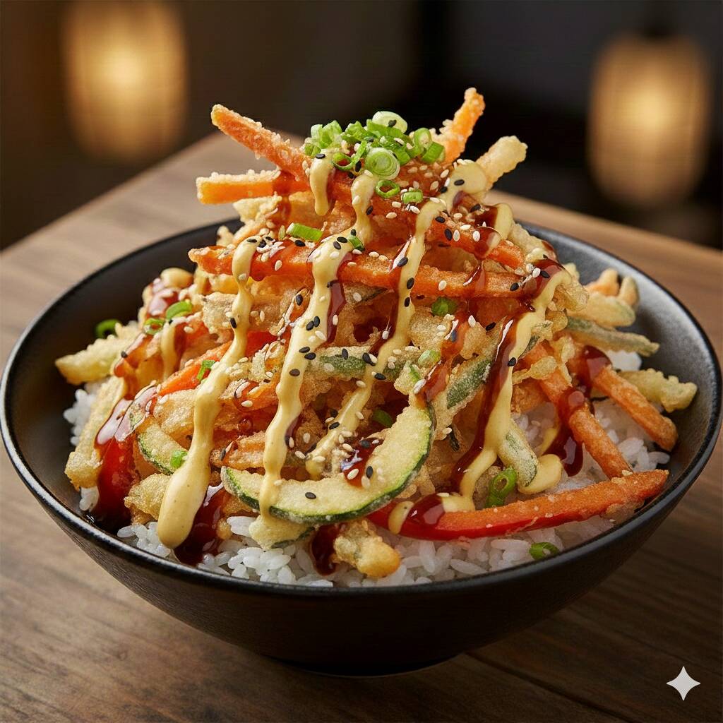 Donburi vegetariano (crocante): Base con arroz de sushi, mix de vegetales, tempura (pimentón, cebolla, zanahoria y zucchini) con salsas de la casa, decorado con cebollín y ajonjolí tostado.
