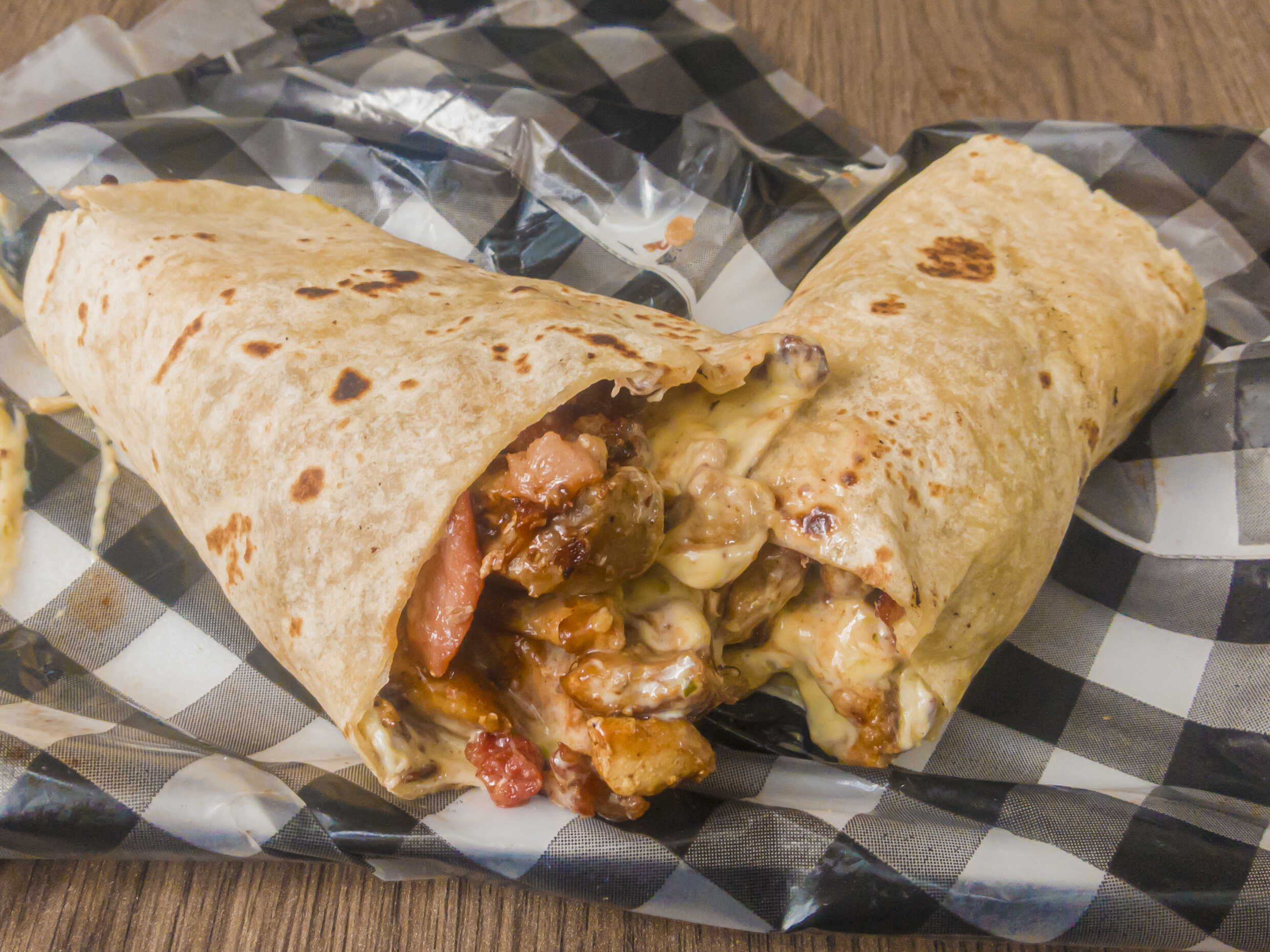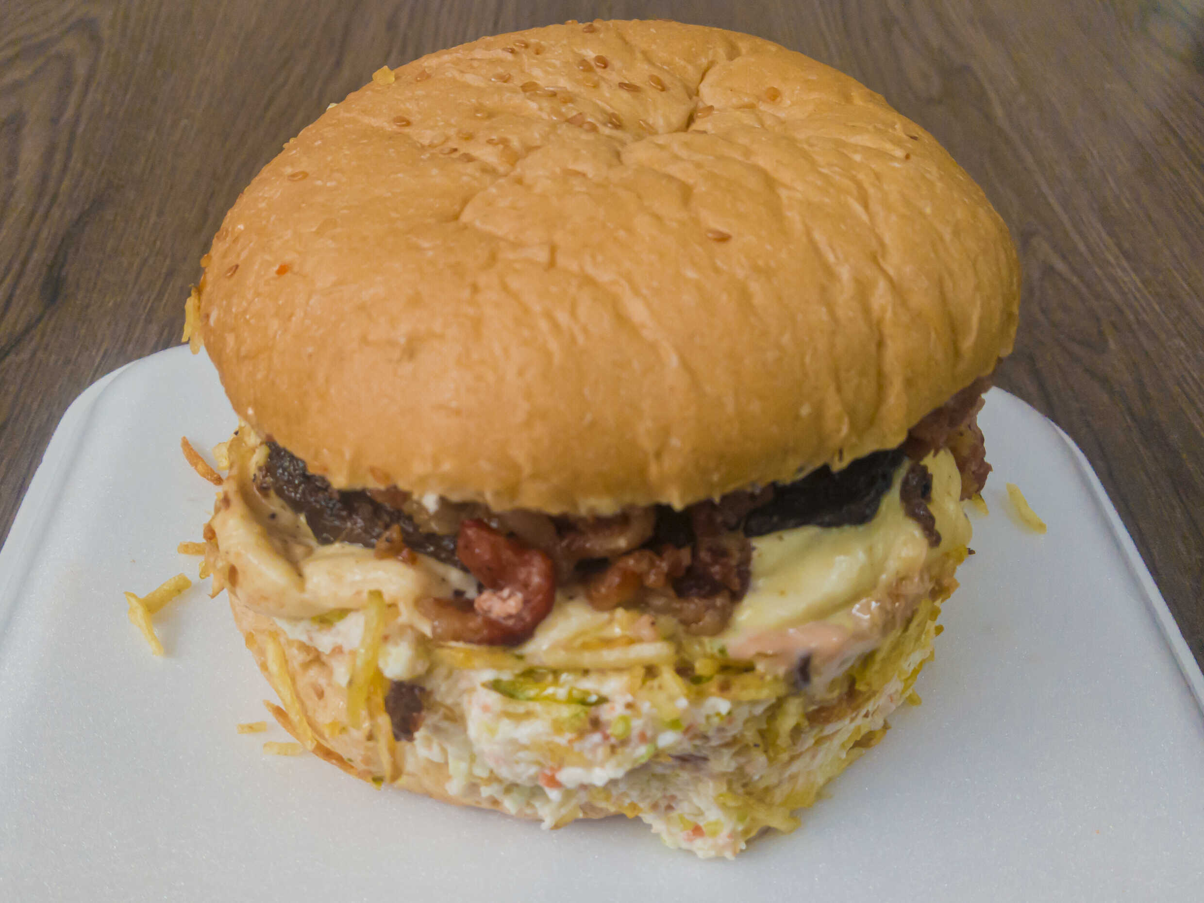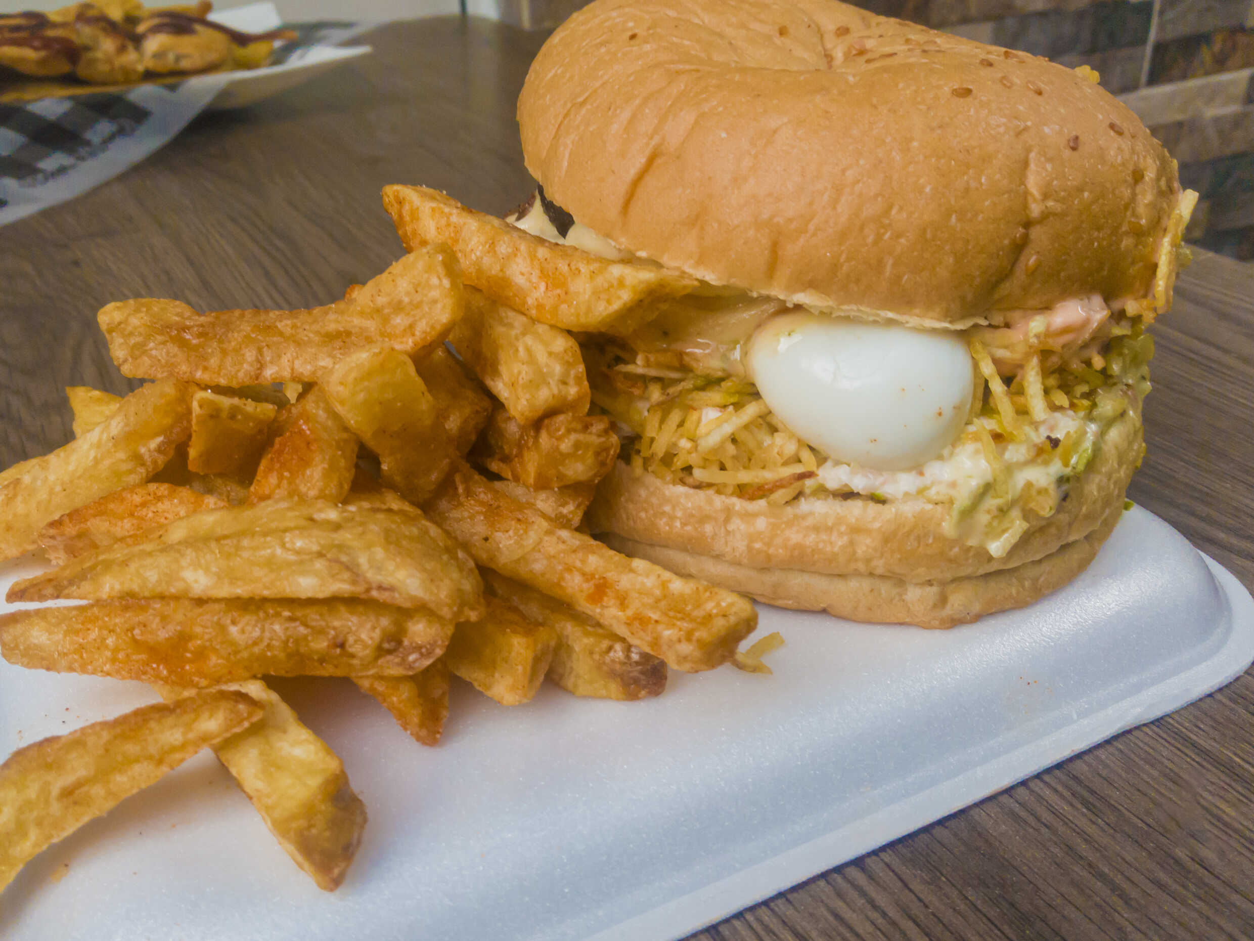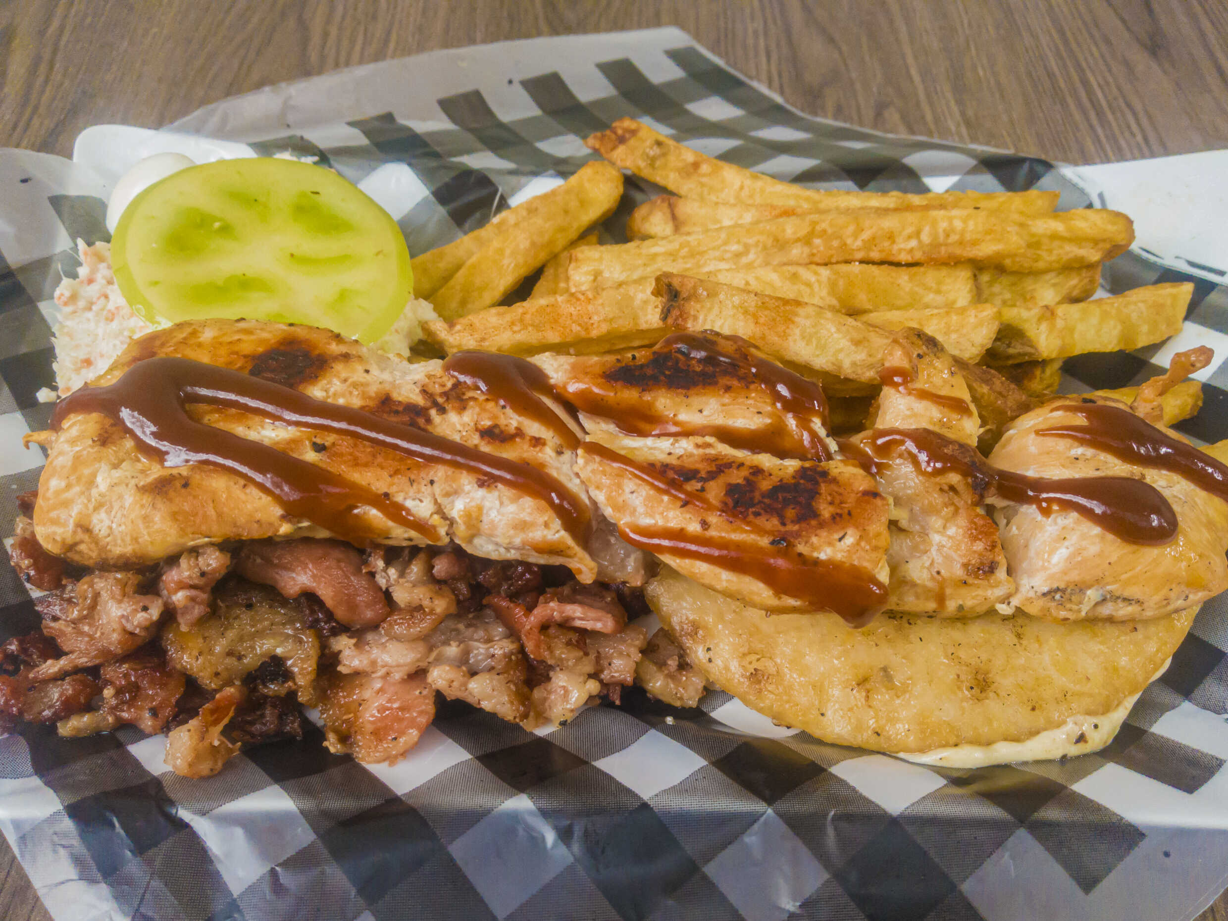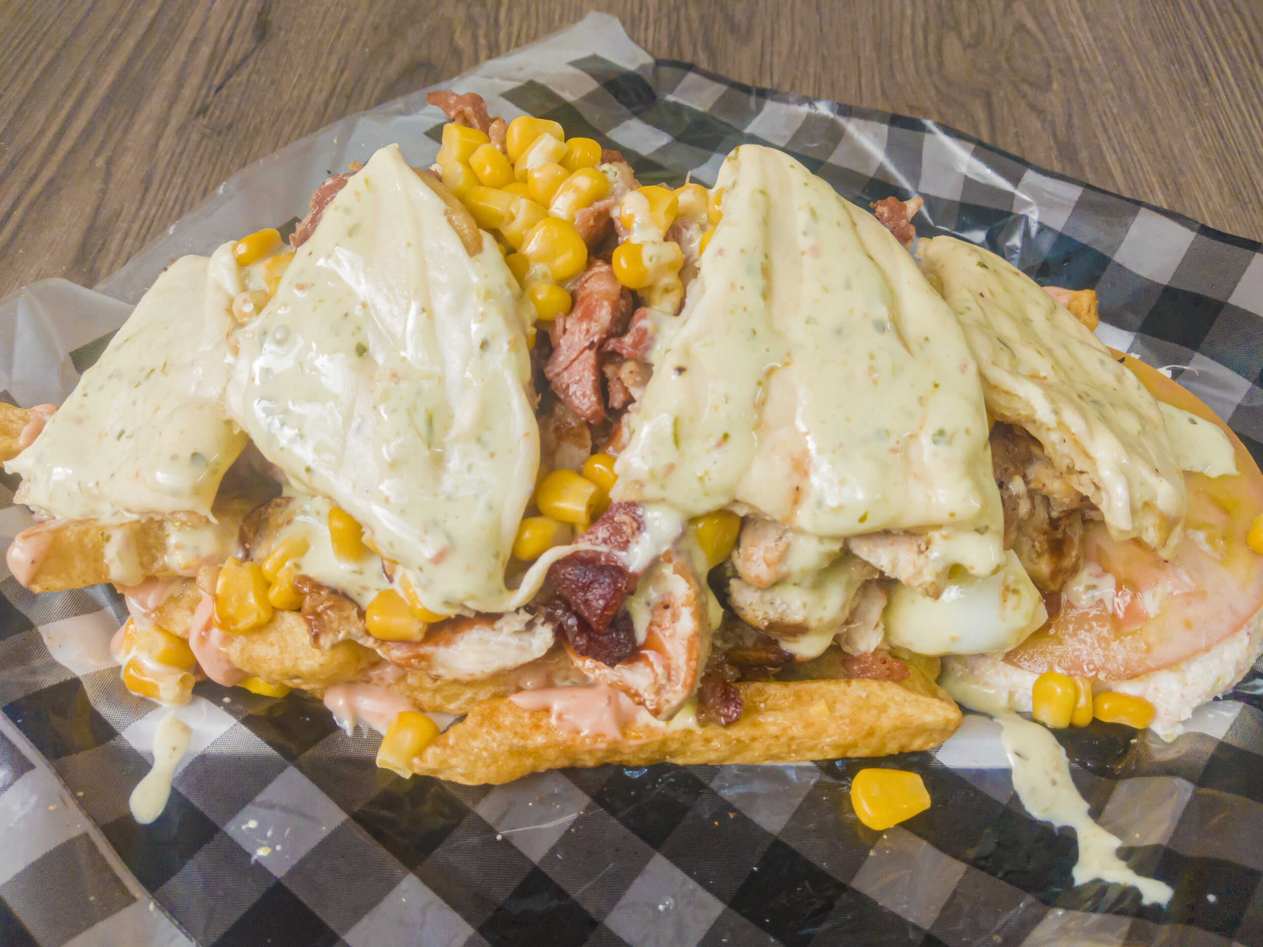 Filete de pollo 150 g, carne de hamburguesa 125 g, queso, tocineta, ensalada de repollo, tomate, ripio y salsas de la casa. Acompañada con papas a la francesa