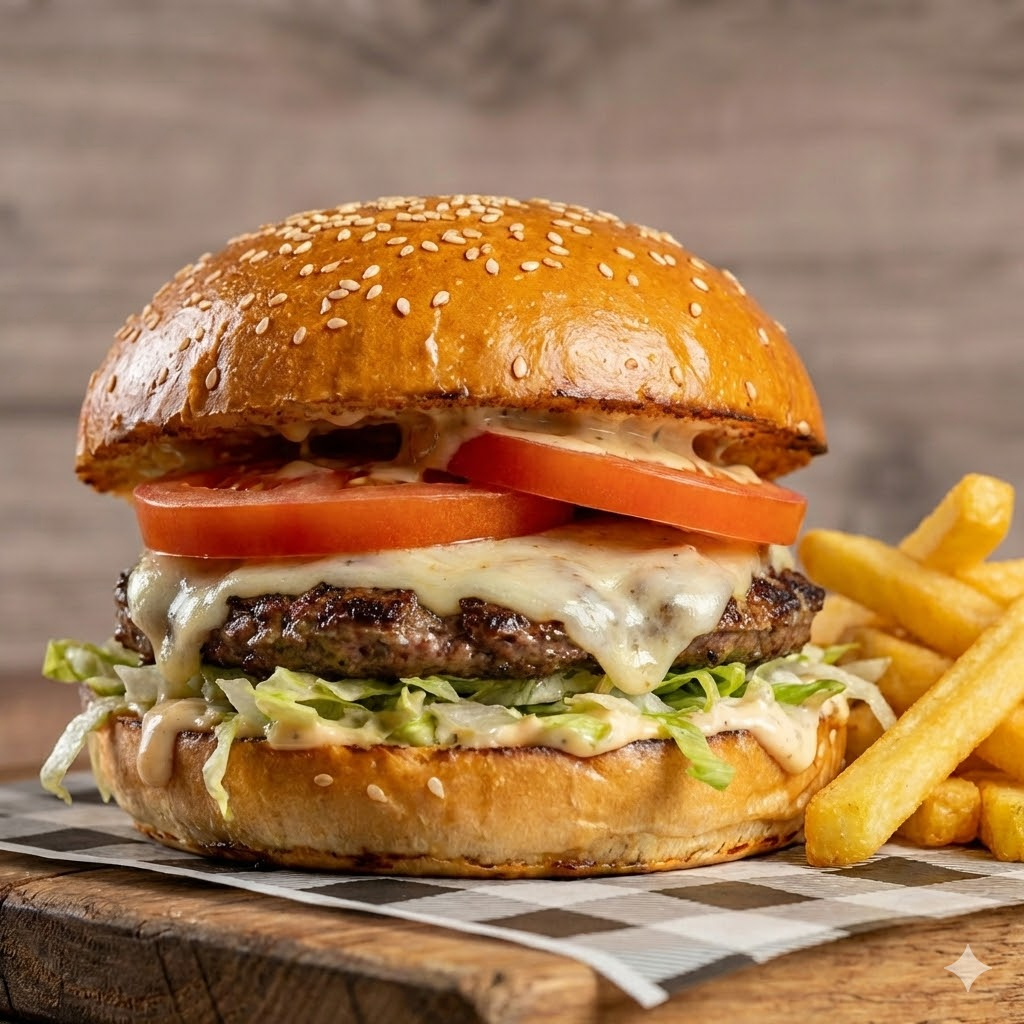 Carne de res 125 gr, pan, queso mozzarella, lechuga, tomate. Acompañada de una porción de papas a la francesa pequeña.