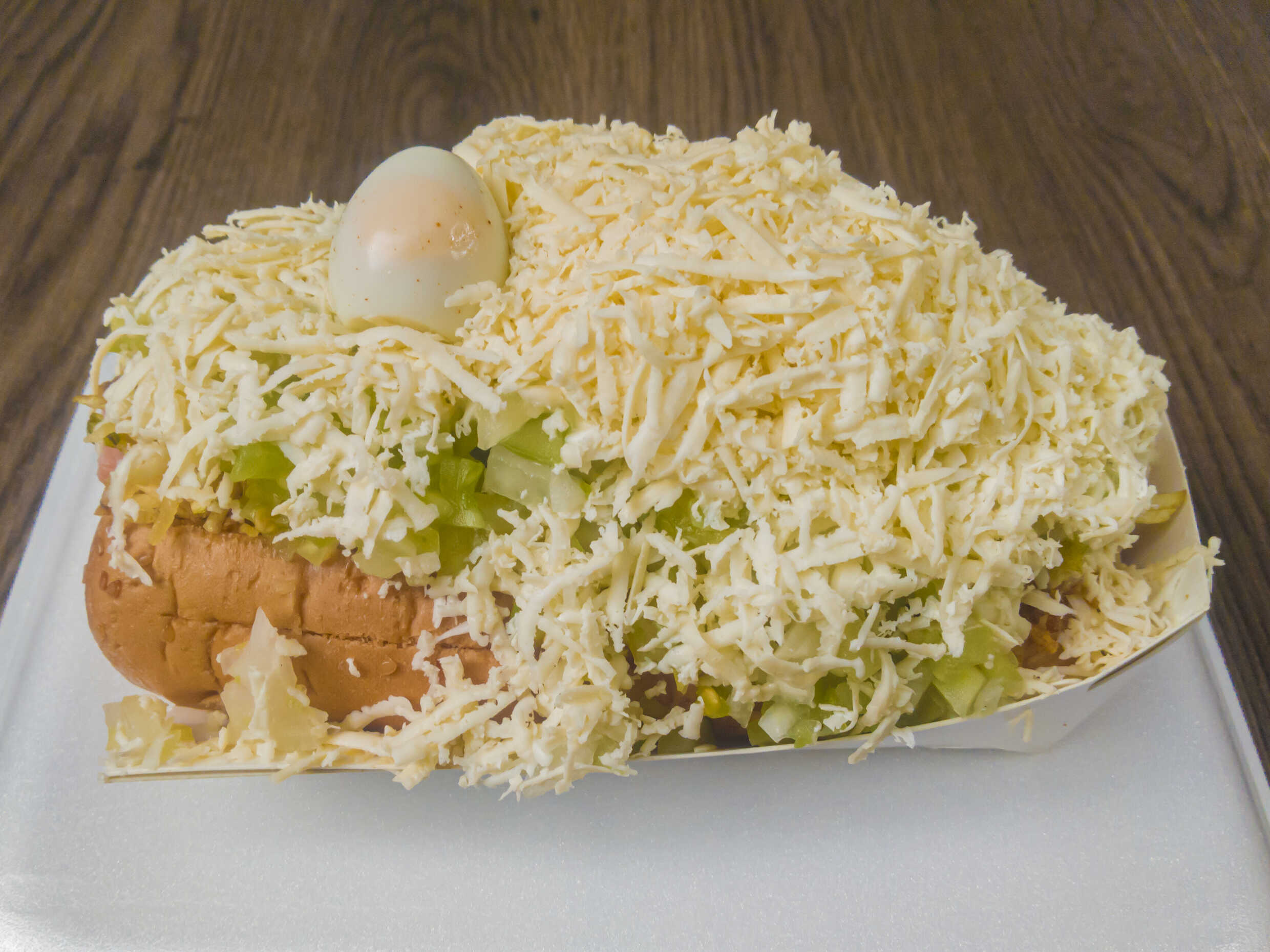 Pan, ensalada de repollo, salchicha, mucho queso, tocineta, ripio de papa, y salsas de la casa. Acompañado con Gaseosa 250ml