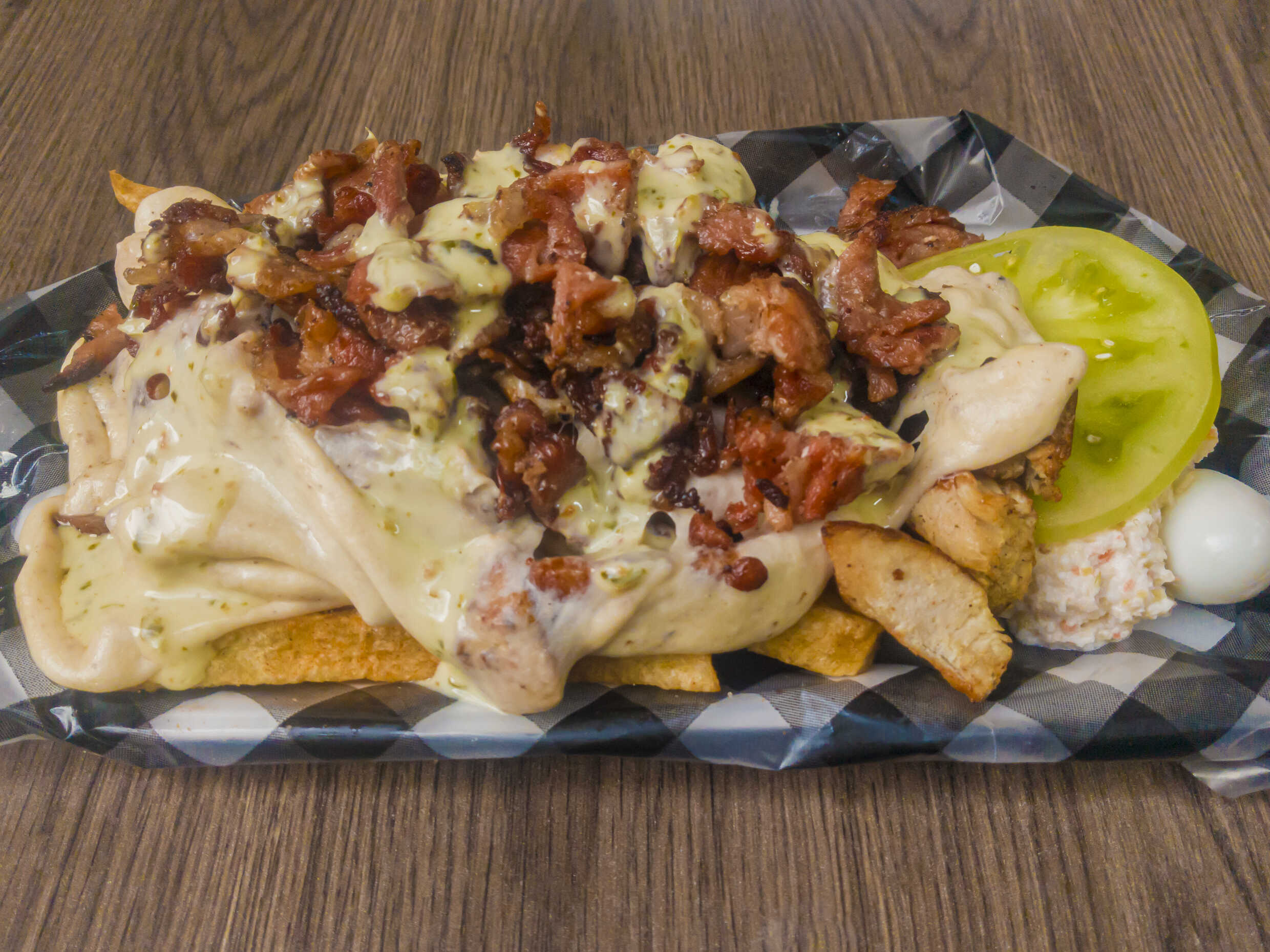 Papas a la francesa, queso, salchicha, tocineta, ensalada de repollo, y salsas de la casa. Acompañada de gaseosa 250ml