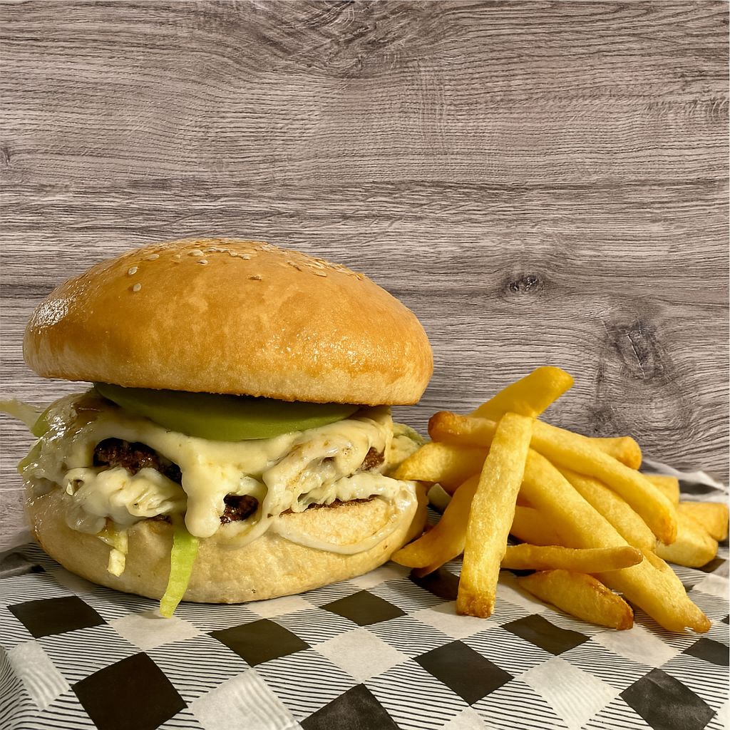 Doble carne de hamburguesa 125g, mucho queso, tocineta, ensalada de repollo, ripio y salsas de la casa. Acompañada con papas a la francesa.