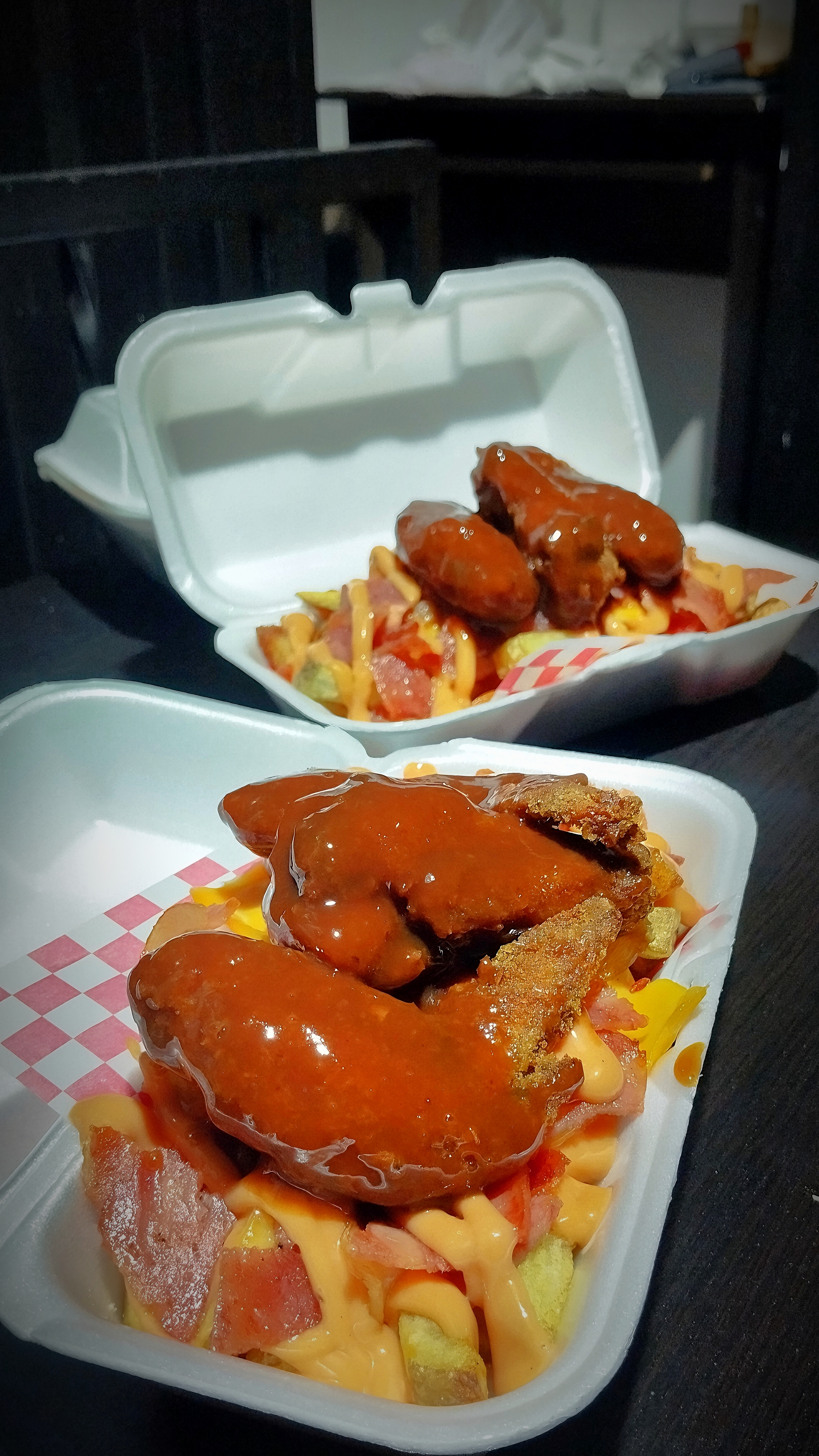 Papas a la francesa con queso cheddar derretido, trozos de tocineta ahumada y 3 alitas adicionales.