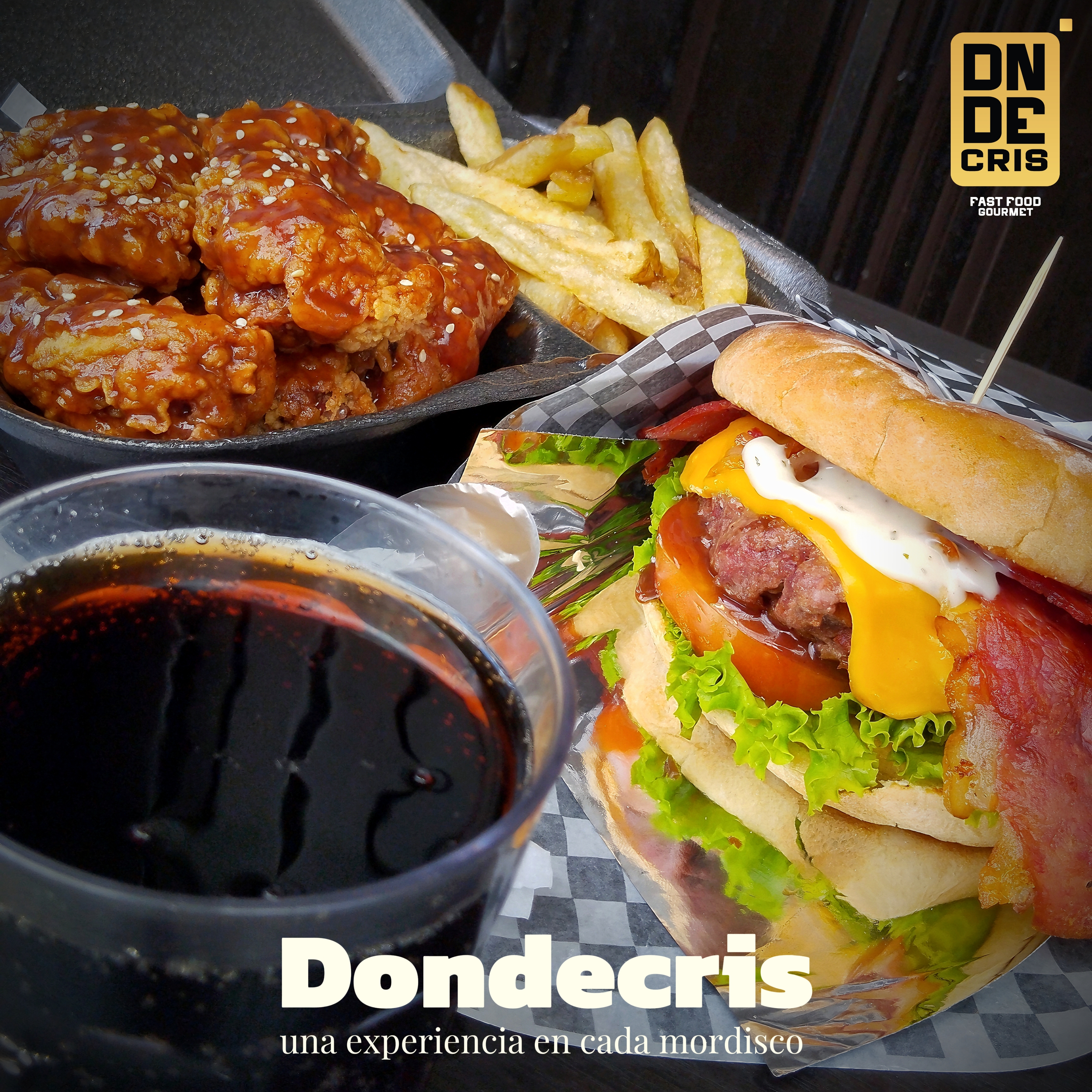 Deliciosa hamburguesa artesanal, 450g de pura carne, jugosa y deliciosa, vegetales frescos, queso cheddar, pepinillos, tocineta ahumada de cerdo, una explosión de sabores y porción de papas