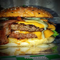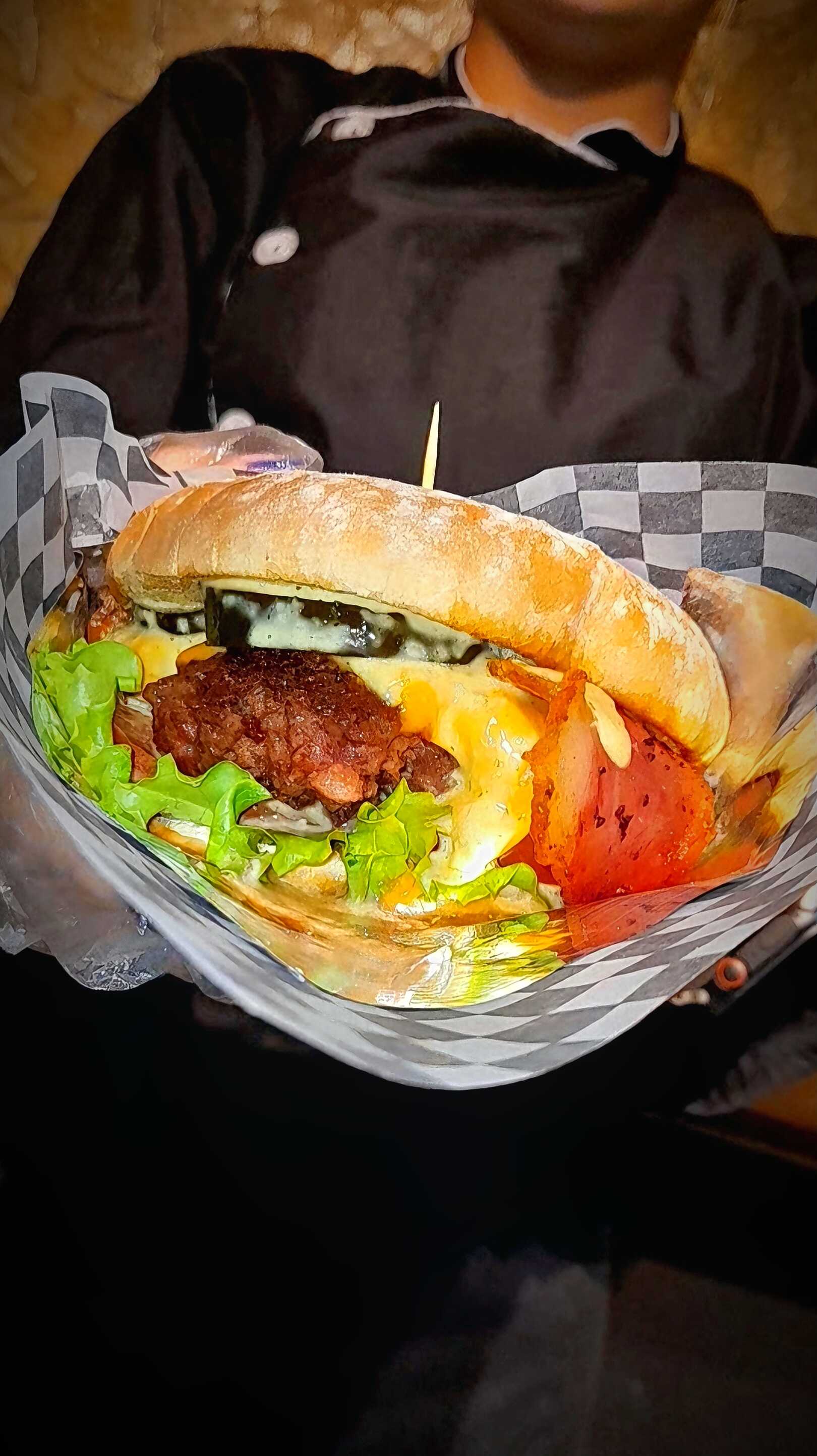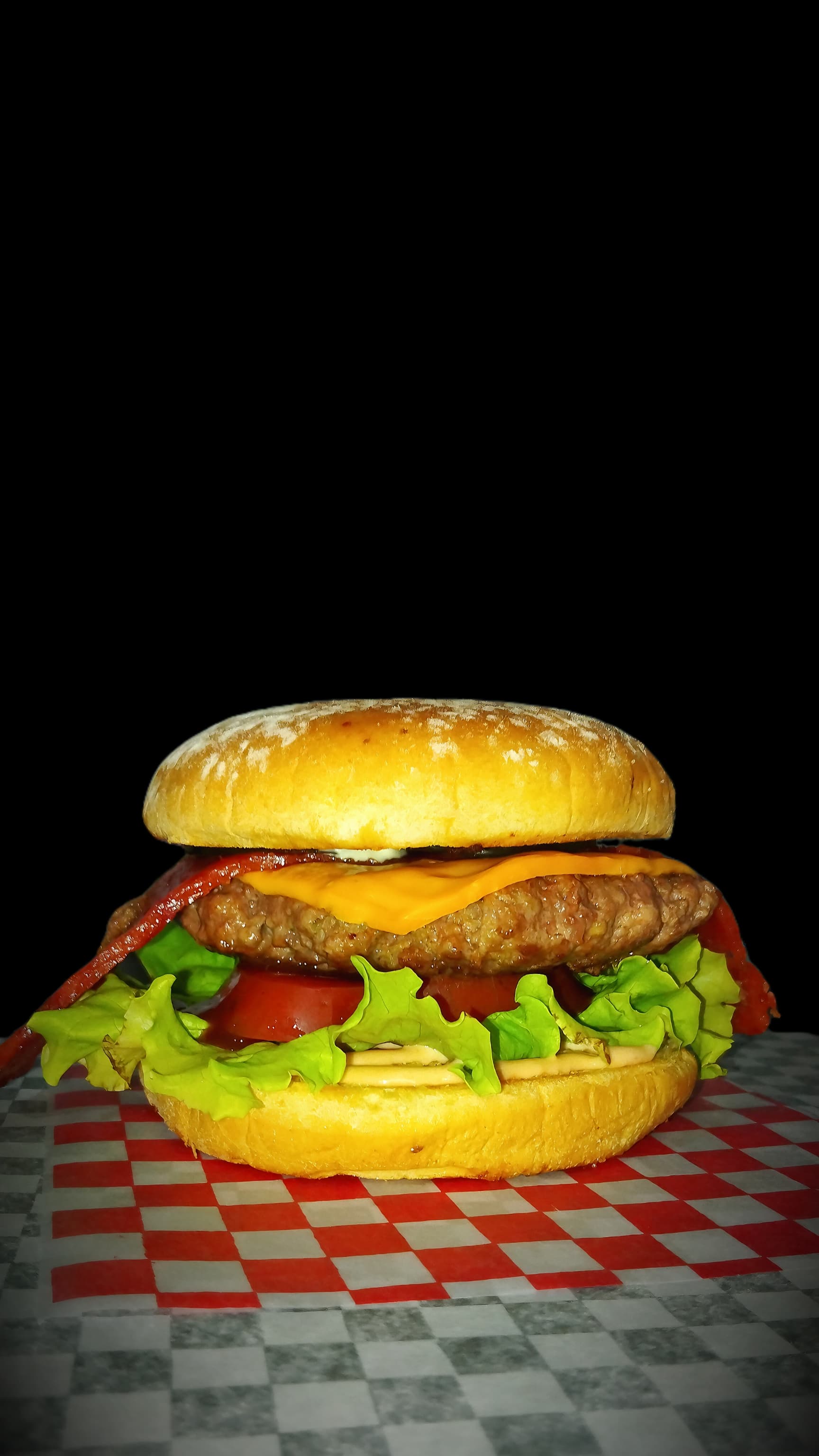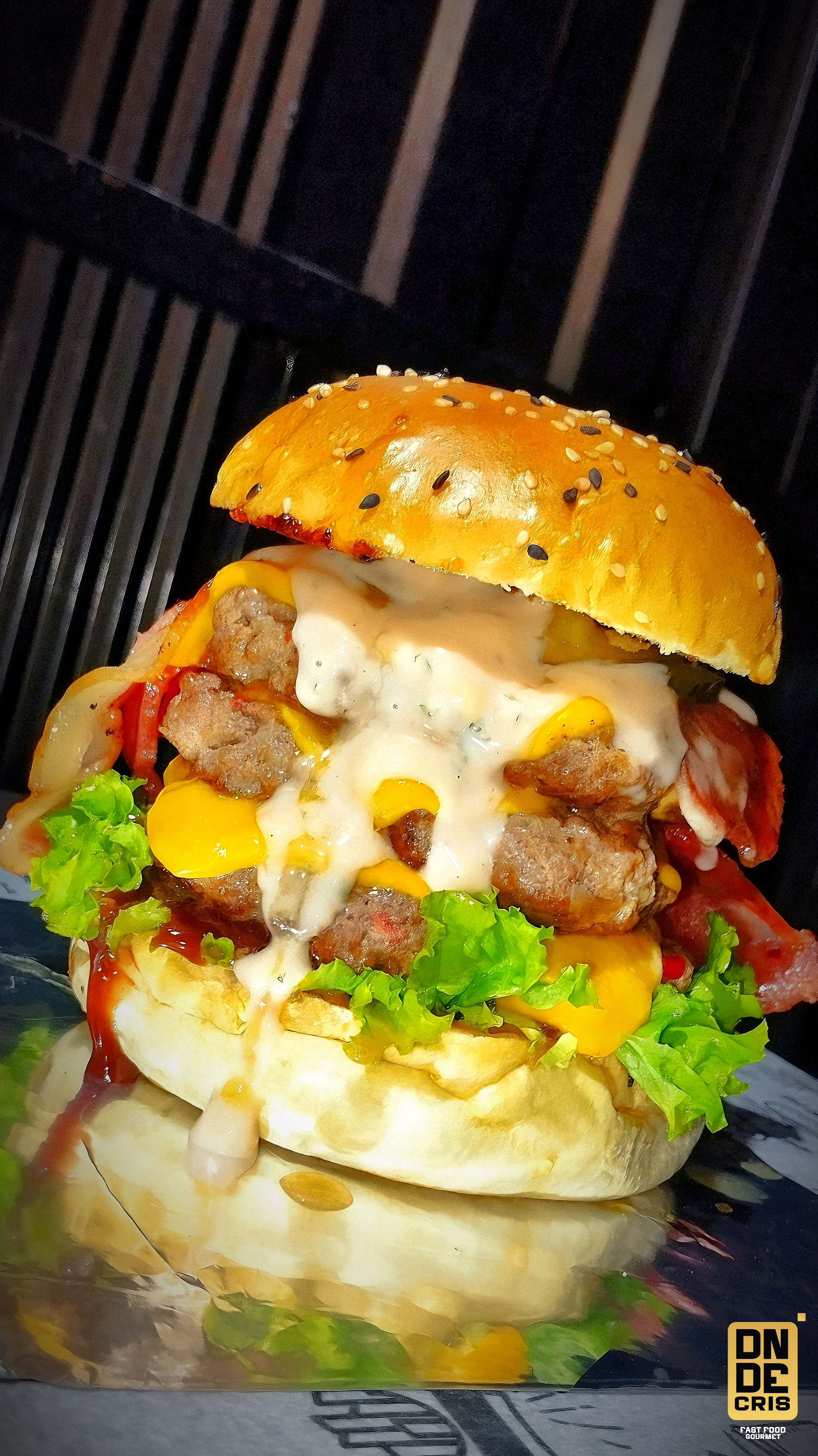 Deliciosa hamburguesa artesanal, 450g de pura carne, jugosa y deliciosa, vegetales frescos, queso cheddar, pepinillos, tocineta ahumada de cerdo, una explosión de sabores