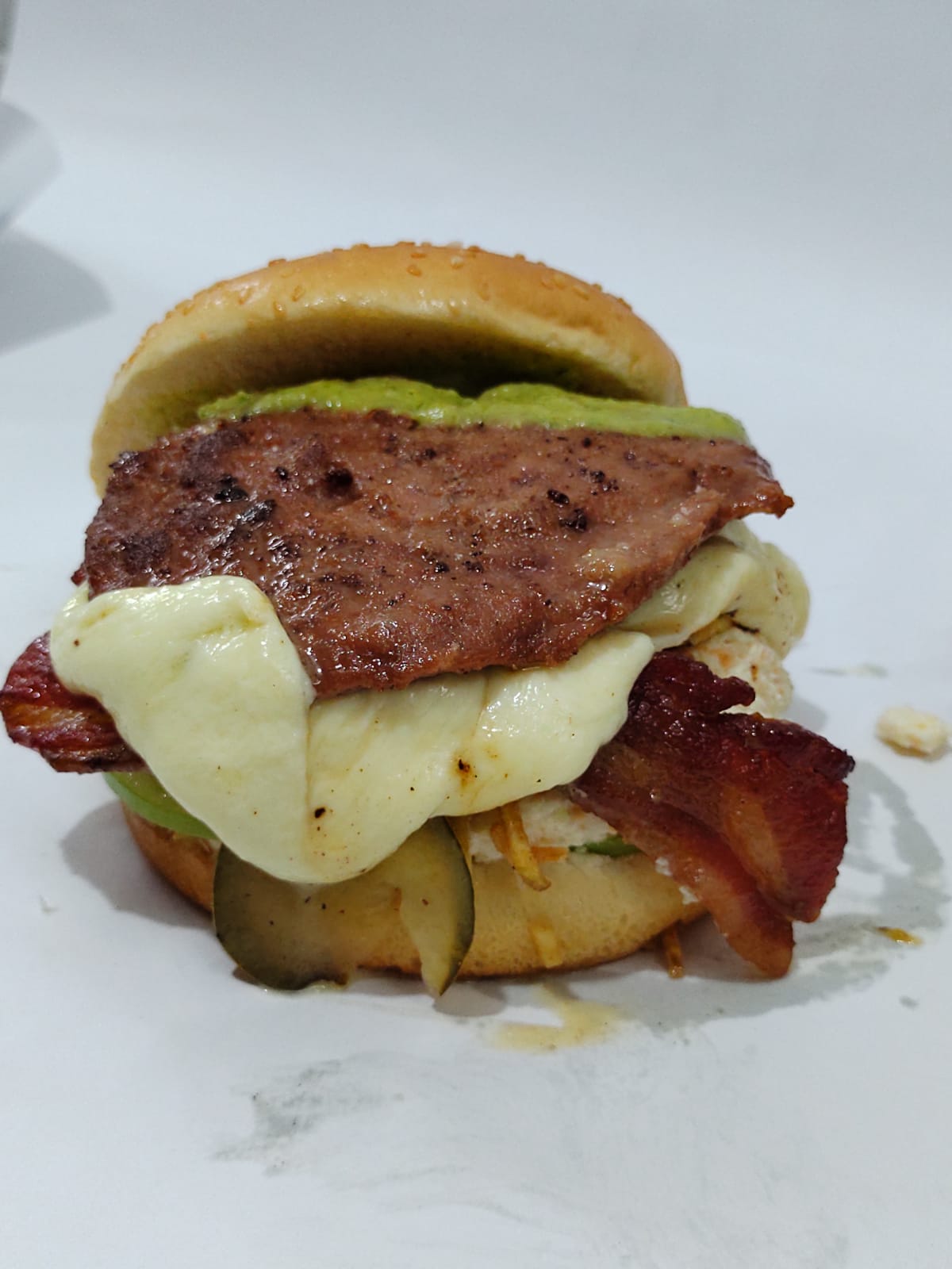 Pan, queso, tomate, doble carne, tocineta, ensalada de repollo, y papas trituradas.