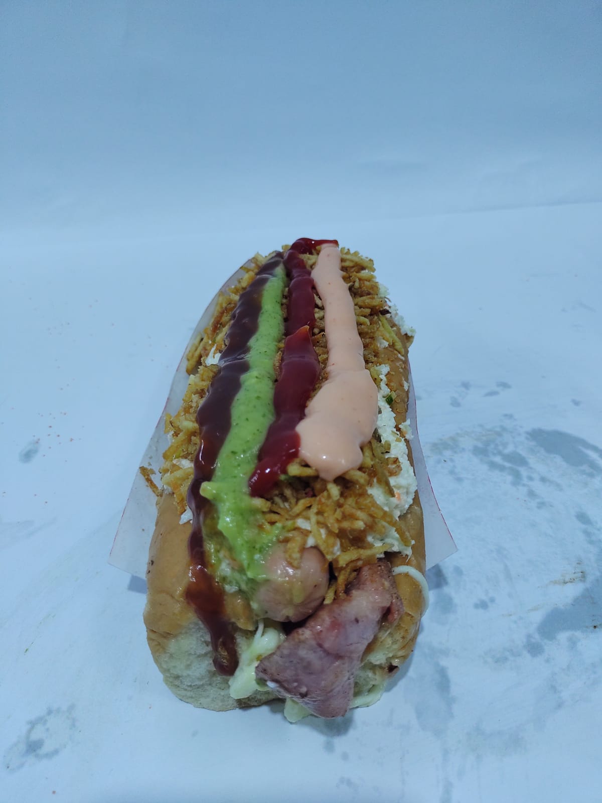 Pan, queso, tomate, carne, tocineta, ensalada de repollo, y papas trituradas.