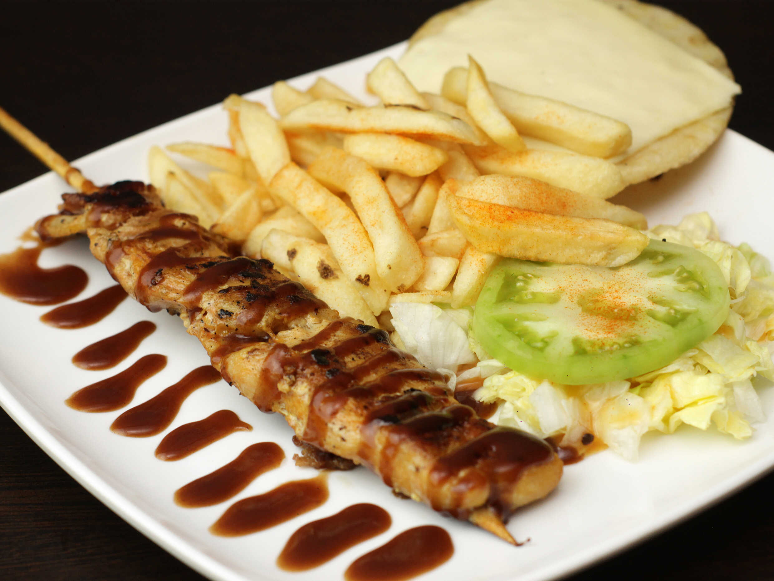Chuzo de pollo, papas a la francesa, ensalada, arepa con queso mozzarella y salsas de la casa.