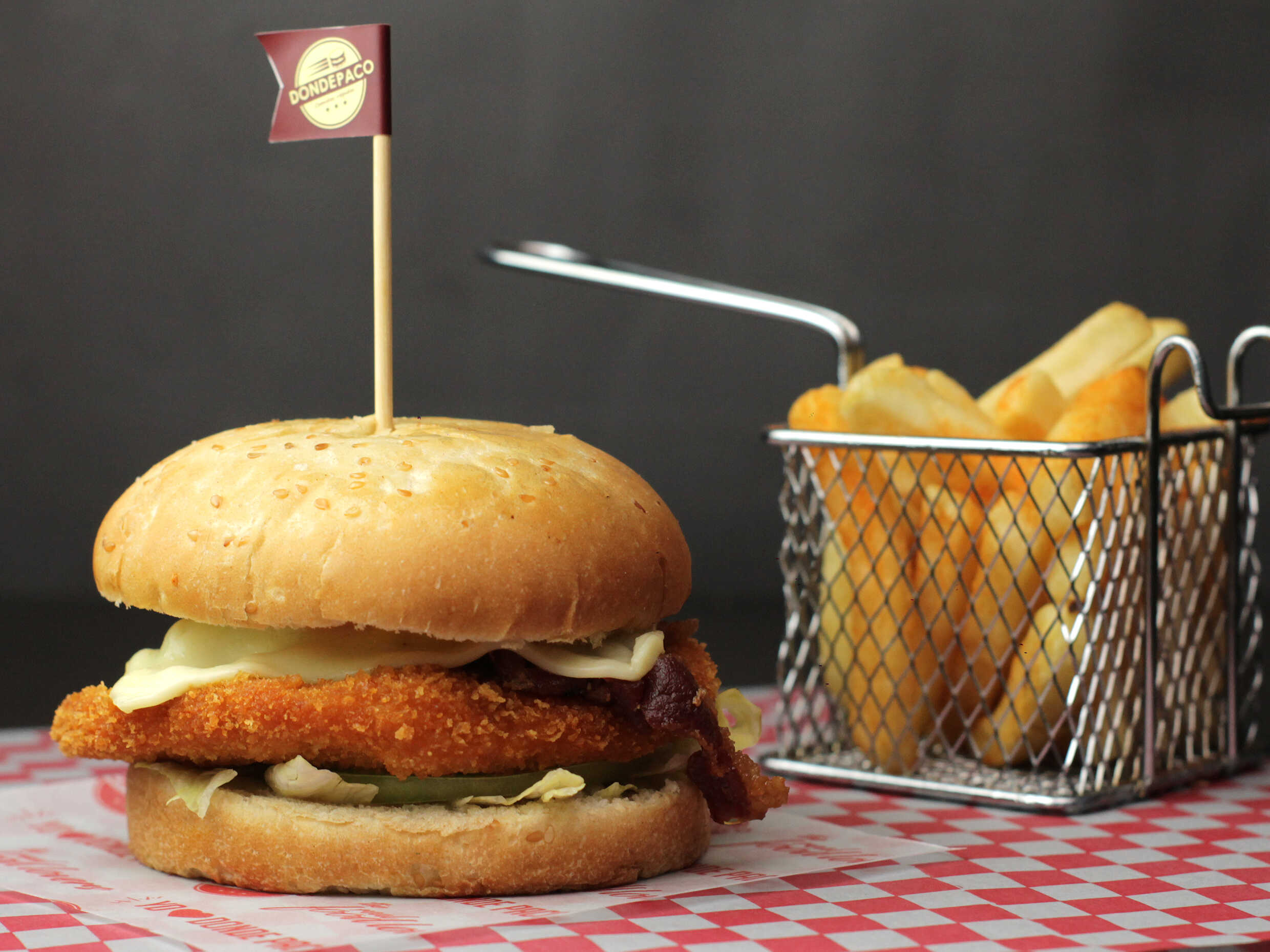 Doble filete de pechuga, doble tocineta, doble queso mozzarella, lechuga, tomate y salsas de la casa.
