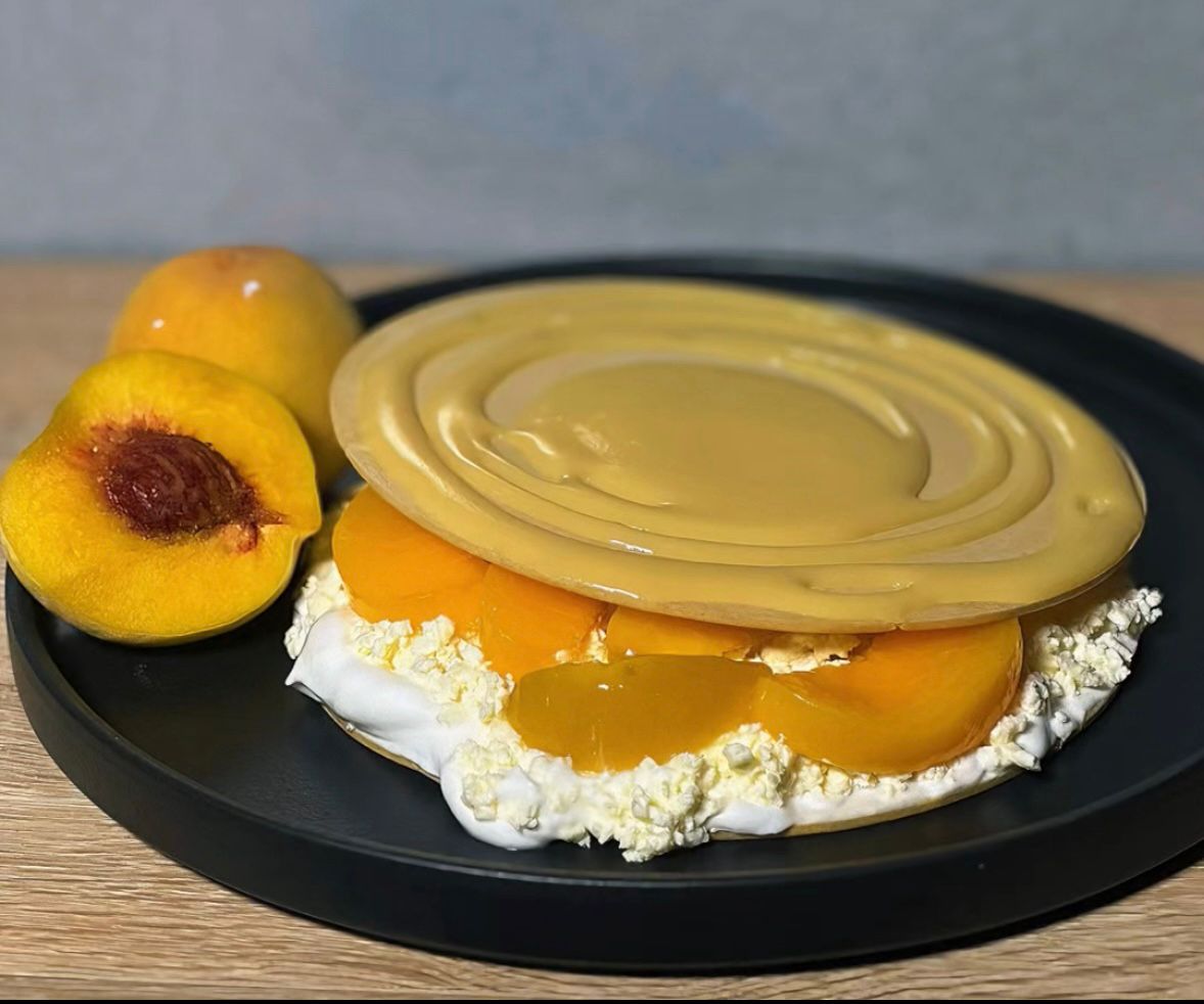 Crema de la casa, duraznos y reducción de frutos amarillos.