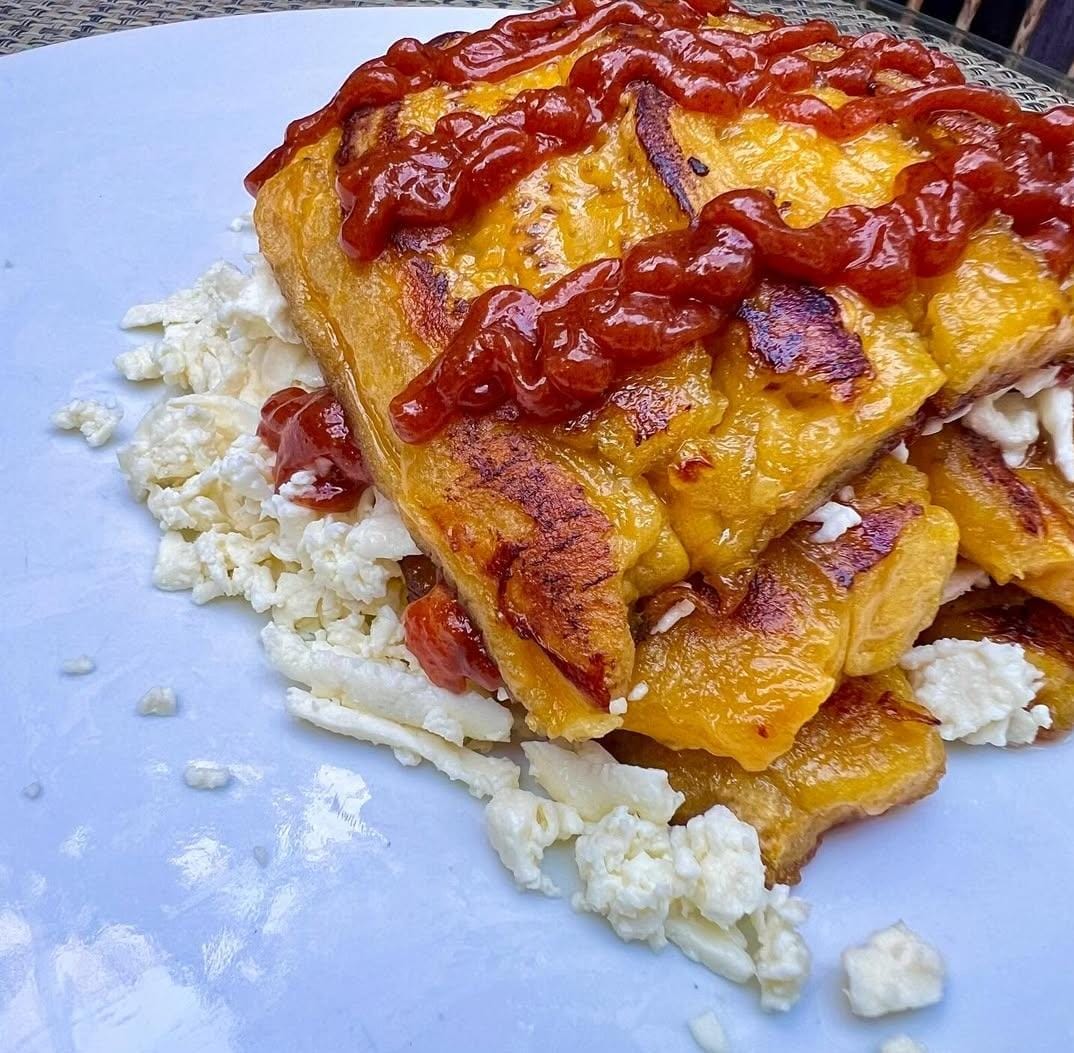 Plátano maduro asado acompañado de queso y dulce de guayaba.