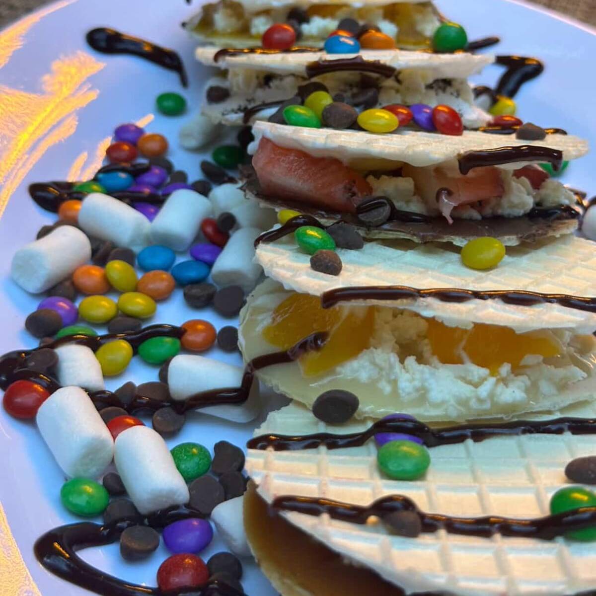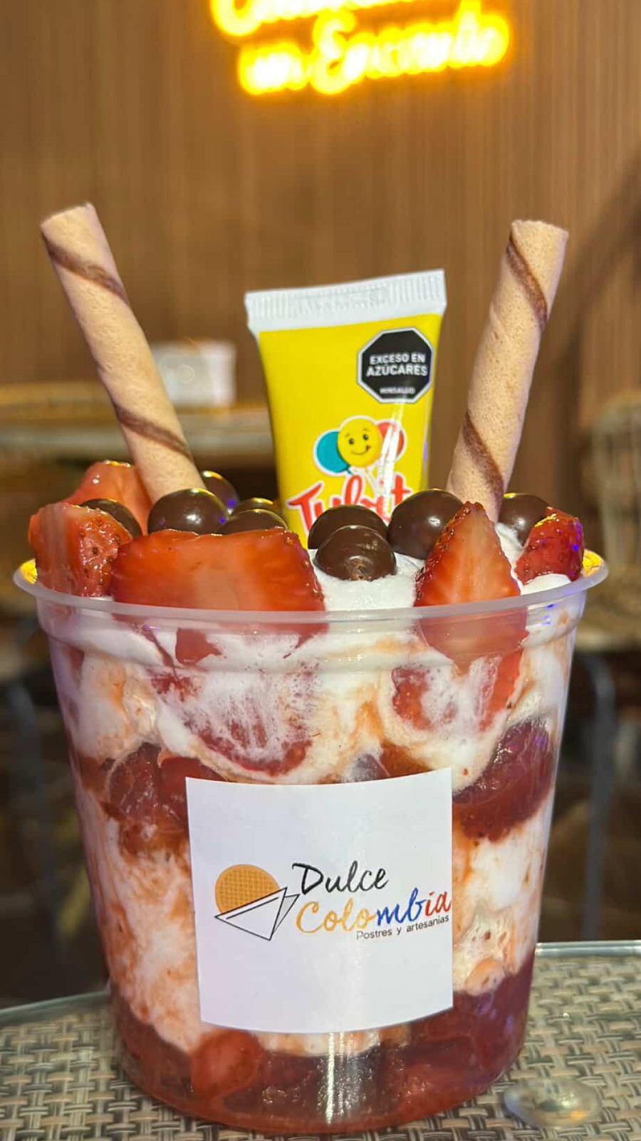 Crema de la casa, Chocoris, Quipitos, Minichips, lecherita en tubito y reducción de fresa.