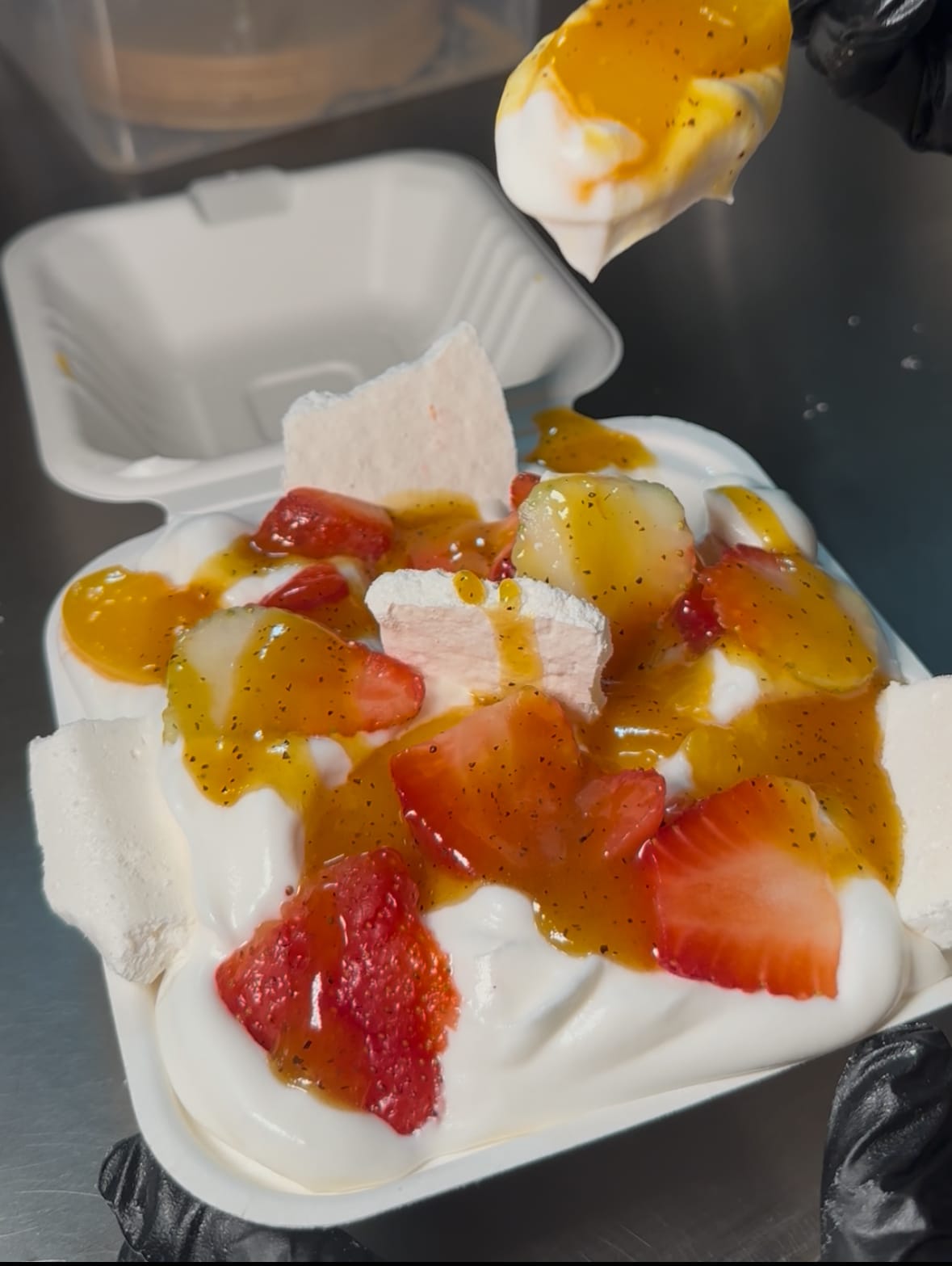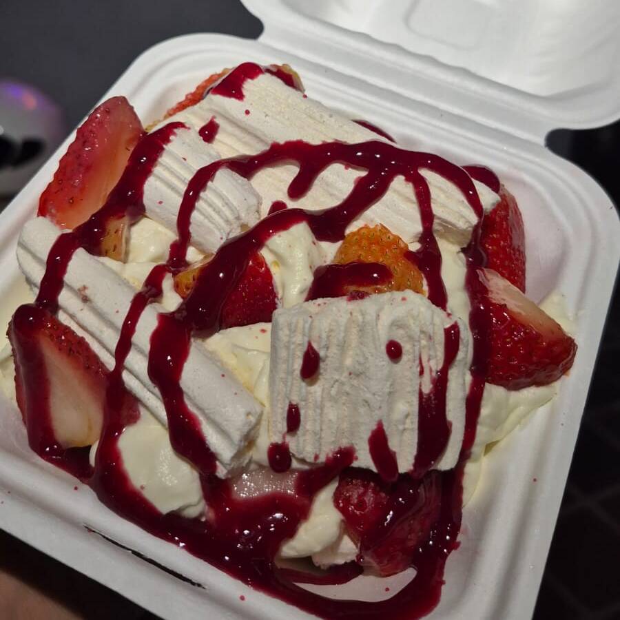 Fresa, duraznos, crema de la casa y reducción de frutos amarillos y frutos rojos.