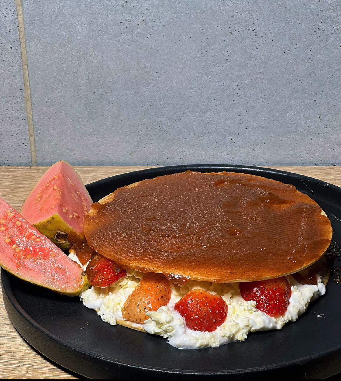 Arequipe, dulce de guayaba, queso y crema de la casa.