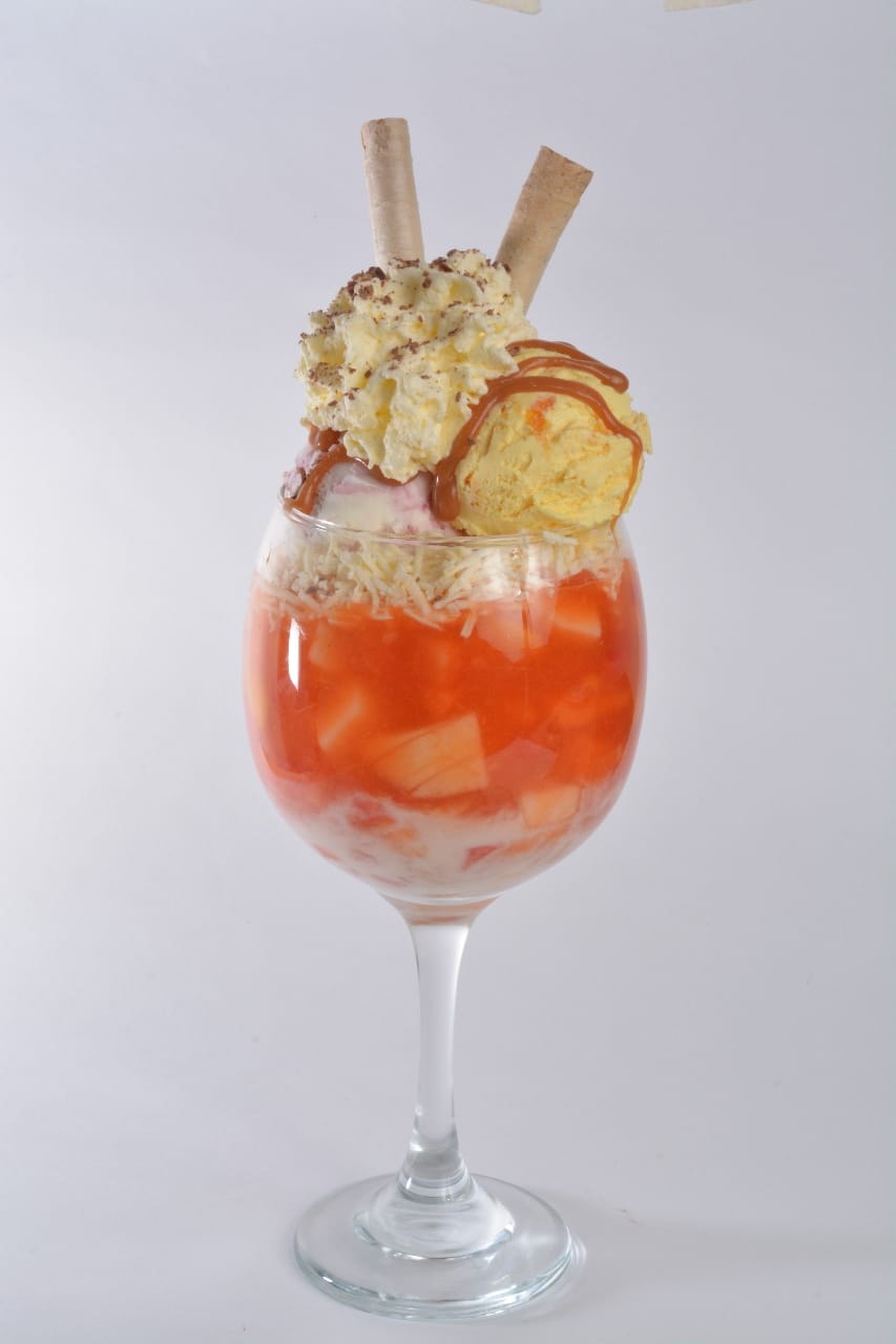 Deliciosa combinación de fruta (sandia, papaya, banano, mango, fresa y manzana) queso, dos sabores de helado, chantilly y barquillo