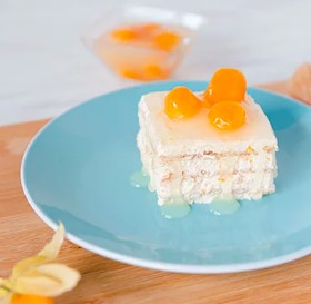 Cheesecake hecho a base de queso crema, pulpa de mandarina y galleta.