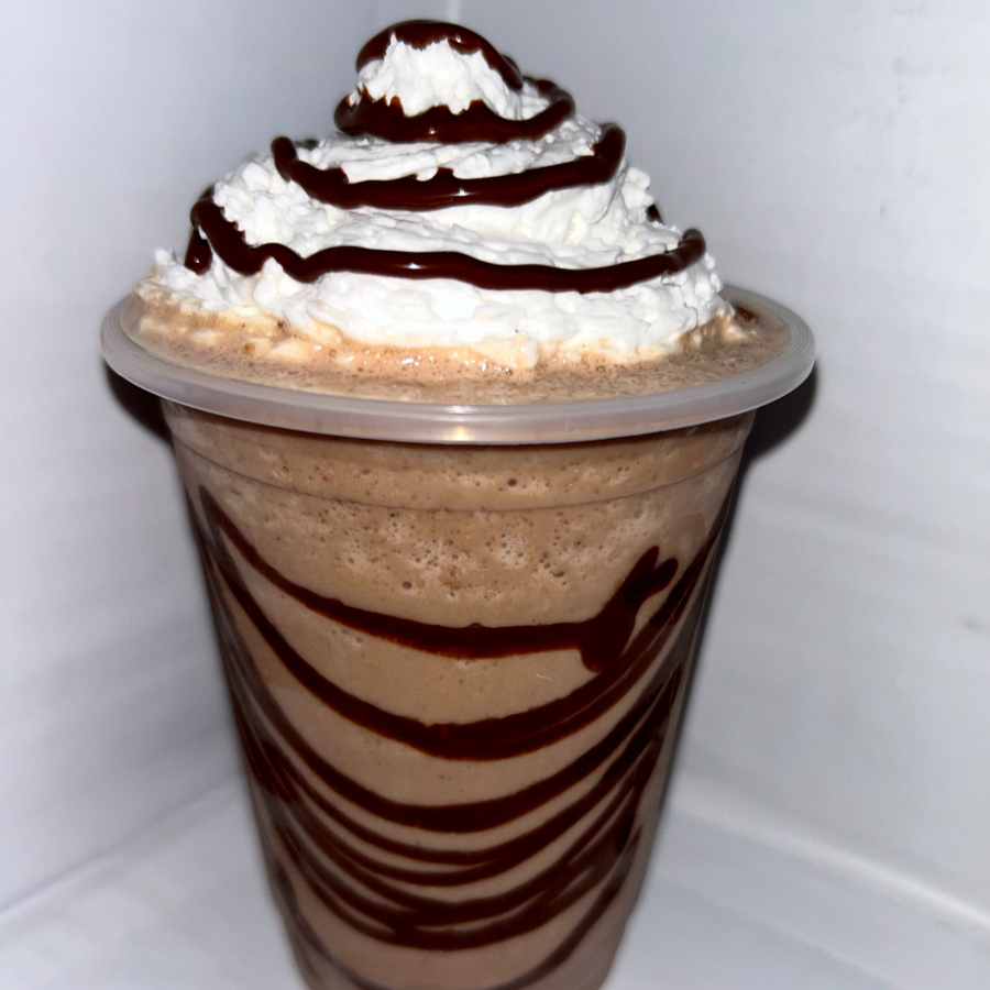 Bebida helada, chocolatada y cremosa, cubierta con chantillí y salsa de nutella.