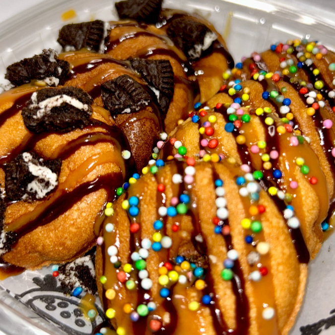 X8 mini donitas artesanales, con grageas de colores, trocitos de galleta oreo y tus salsas de preferencia.