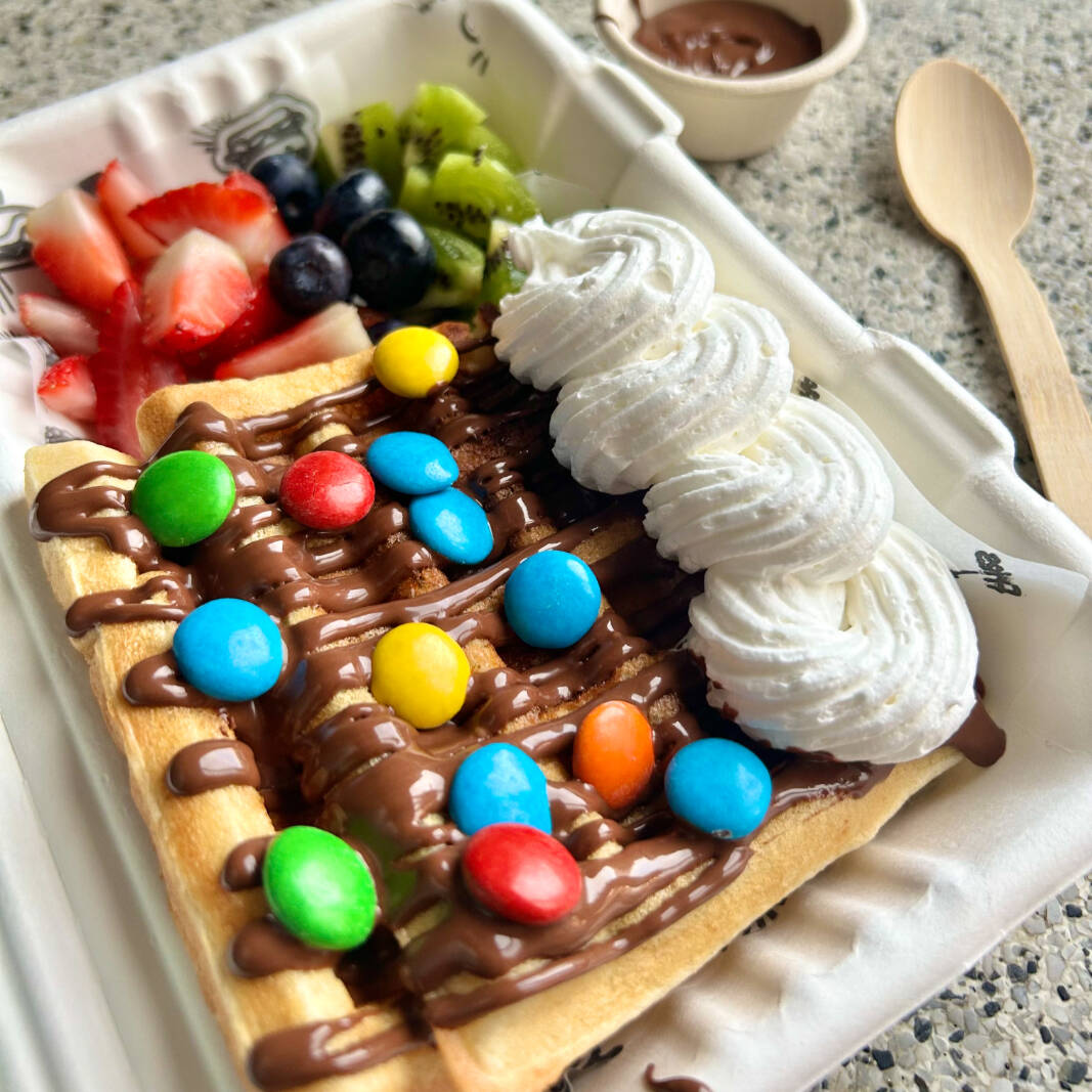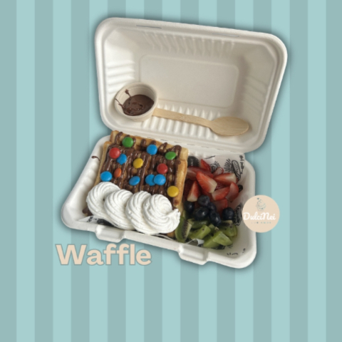 2 uds. de waffle, fresa picada, trozos de kiwi, arandanos, chantillí, 1 dip de salsa y m&m.