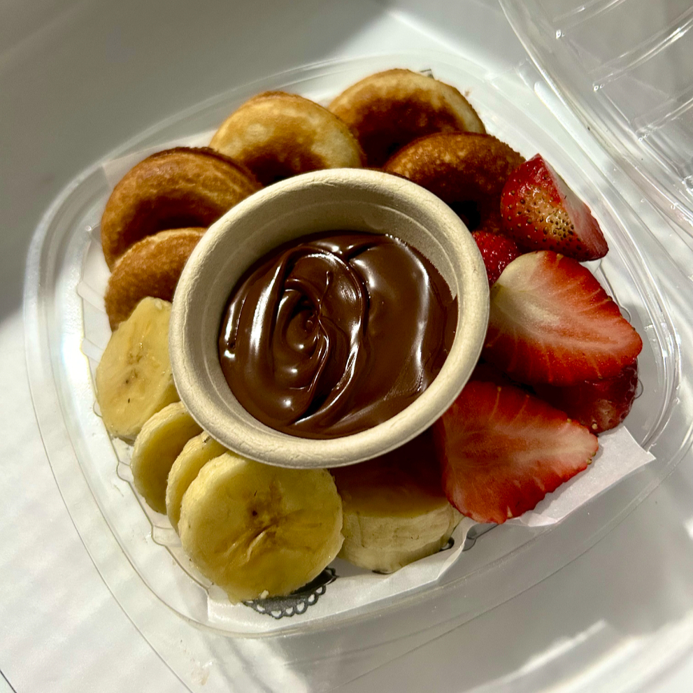 x6 uds. de donitas, fresas picada, banano en rodajas y un dip de salsa.