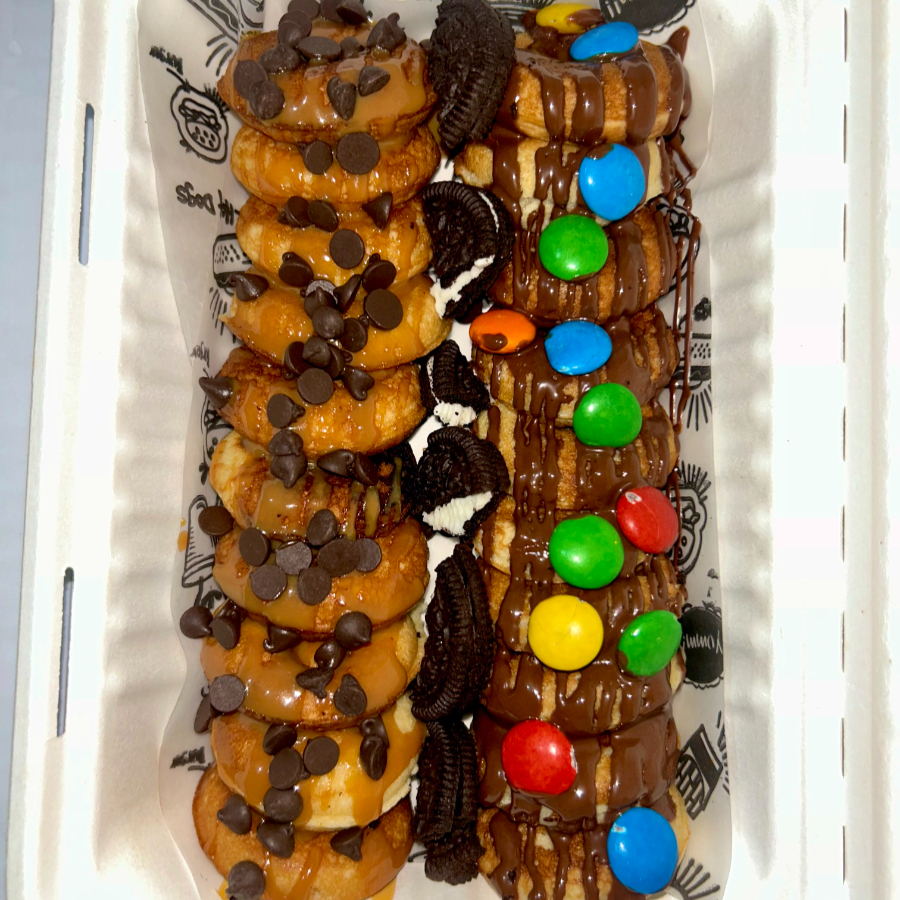 x20 uds. de donitas, topping de m&m, chips de chocolates y trozos de galleta oreo y dos salsas.