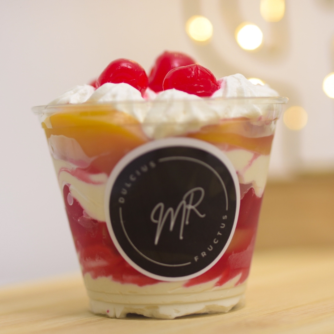Un clásico frutal que nunca falla: crema suave acompañada de trozos de durazno y cerezas, un equilibrio perfecto entre cremosidad y frescura.