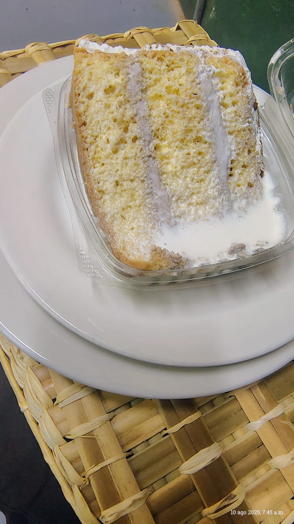 Esponjoso y suave bizcocho de vainilla, con relleno de crema pastelera y arequipe y baño en tres leches.