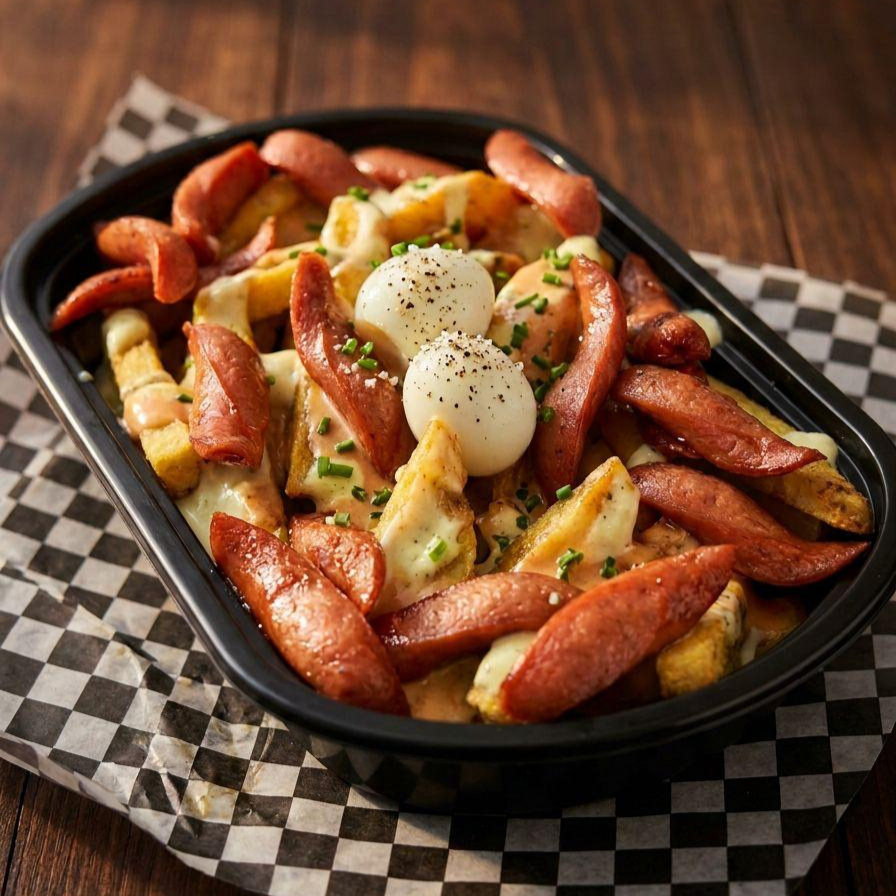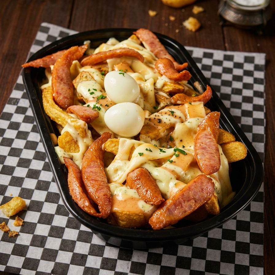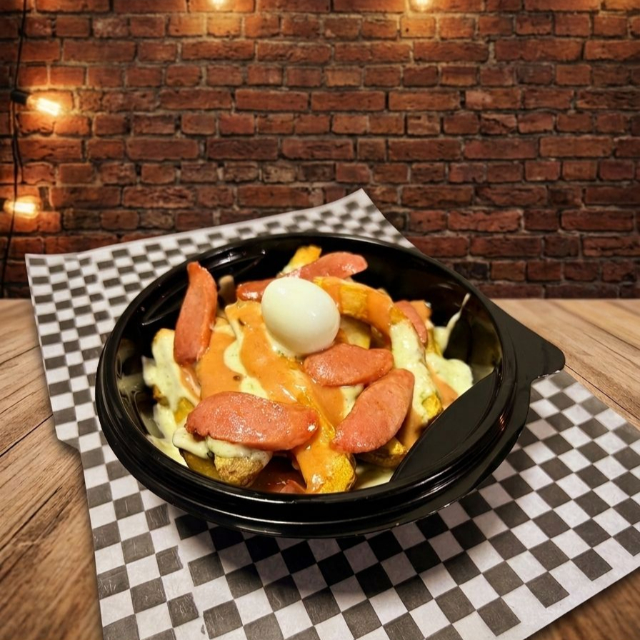 Salchicha ranchera Queso mozzarella Papa francesa artesanal Salsa rosada de la casa Salsa el bajón Huevos de codorniz